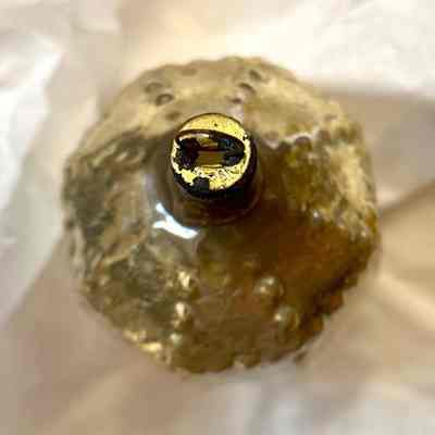 Description: A glass ornament, painted monochromatic yellow-gold, forming an eight-sided lantern with sewn connections. The cap states 'JAPAN'.