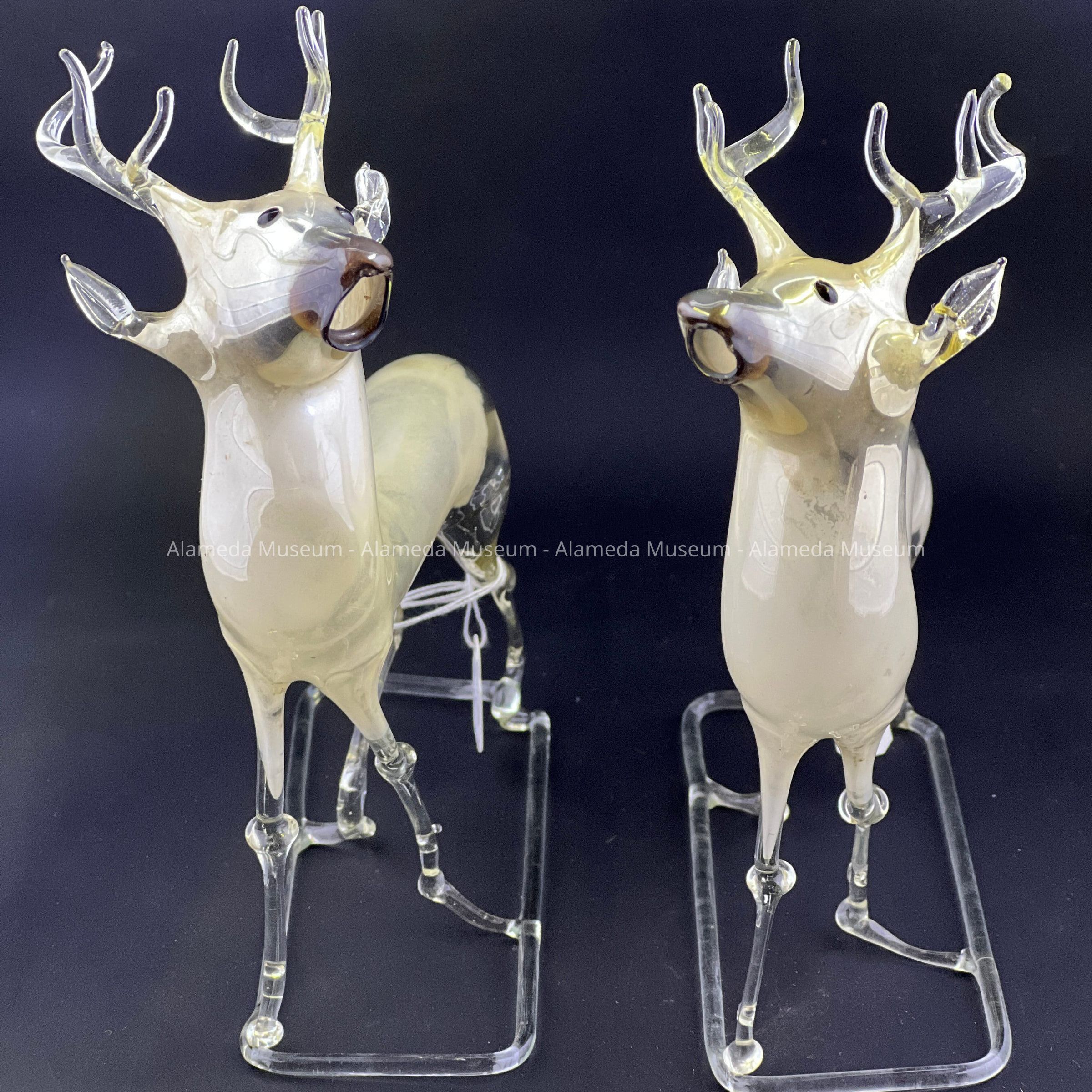 Description: These mercury blown glass reindeer are two different sizes, large and small. Made with Bimini Glass, they have survived for over a century with small breaks to the antlers and bases.