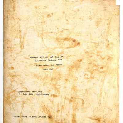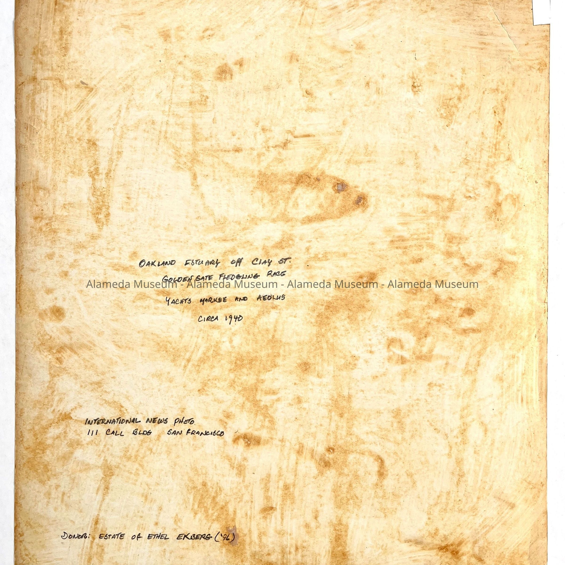 Description: Glossy black/white photo, unmounted (but with a brownish glue residue on its verso). Photographer: International News Photo, San Francisco (unmarked, but a smaller version of this image - 96.196.87 - has an attribution stamp on its verso). Minor damage to the image: upper left corner crease and a small hole a half-inch from its bottom edge.