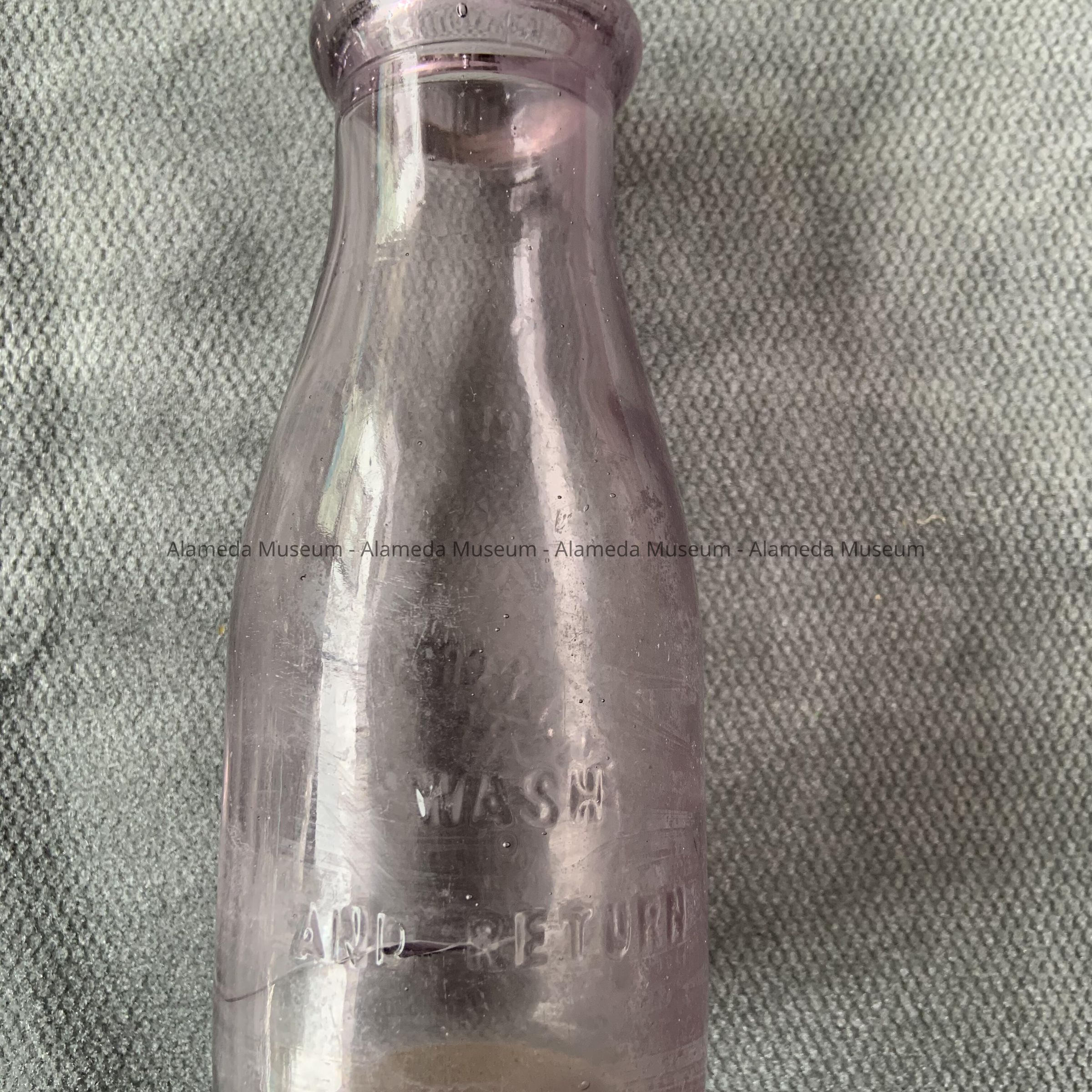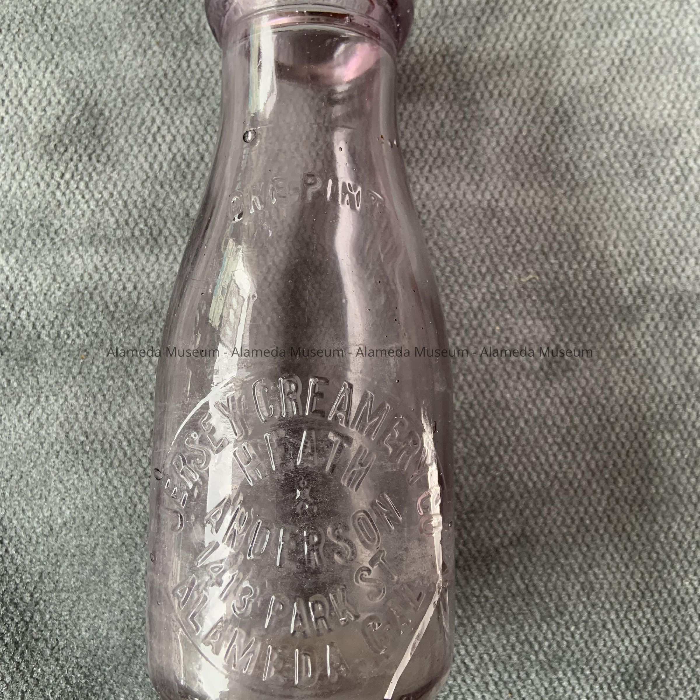 Description: A double seam, pint size, glass bottle that has turned lavender, with an embossed caption: "Jersey Creamery Co., Heath & Anderson, 1413 Park St. Alameda, Cal.". The bottle is cracked near its base.