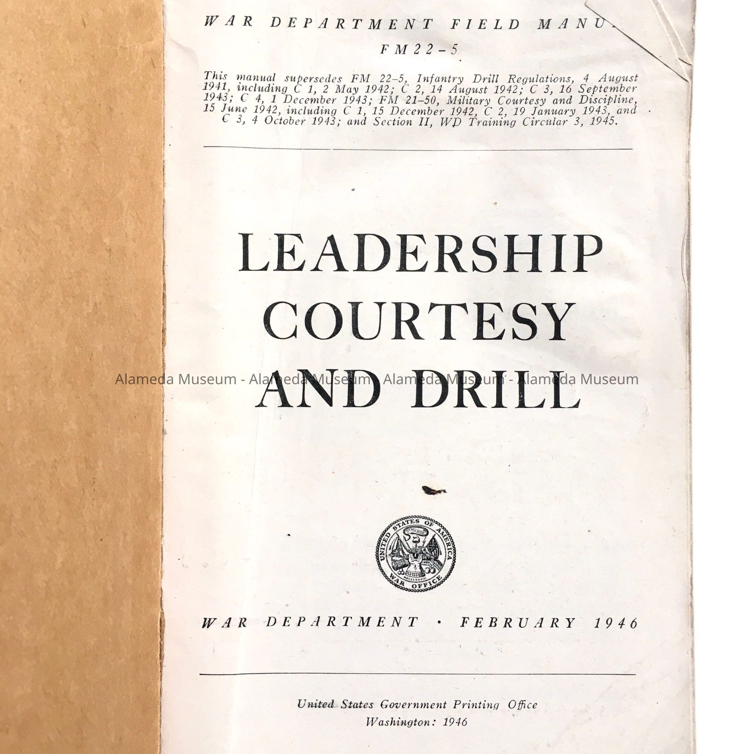A BOOK ISSUED BY THE WAR DEPARTMENT IN FEBRUARY 1946 ON "LEADERSHIP, COURTESY, AND DRILL, " USED BY OTTO RITTLER FOR REFERENCE PURPOSES.
