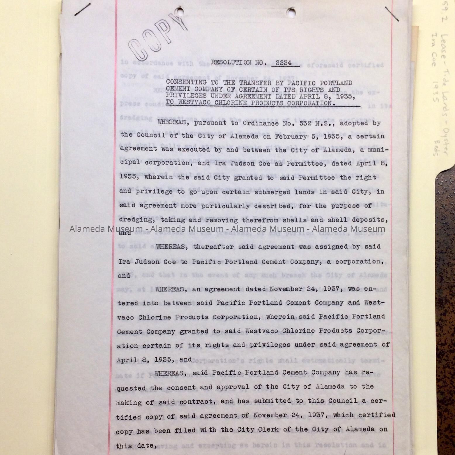 b. Transfer of lease from Ira Judson Coe to the Pacific Portland Cement Company and Pacific and California Chemical Company and its successor Westvaco Chlorine Products Corporation, and to the subsequent transfer of the rights of the former company to the latter, in 1937. Drawn up by D. Elmer Dyer, City Clerk.