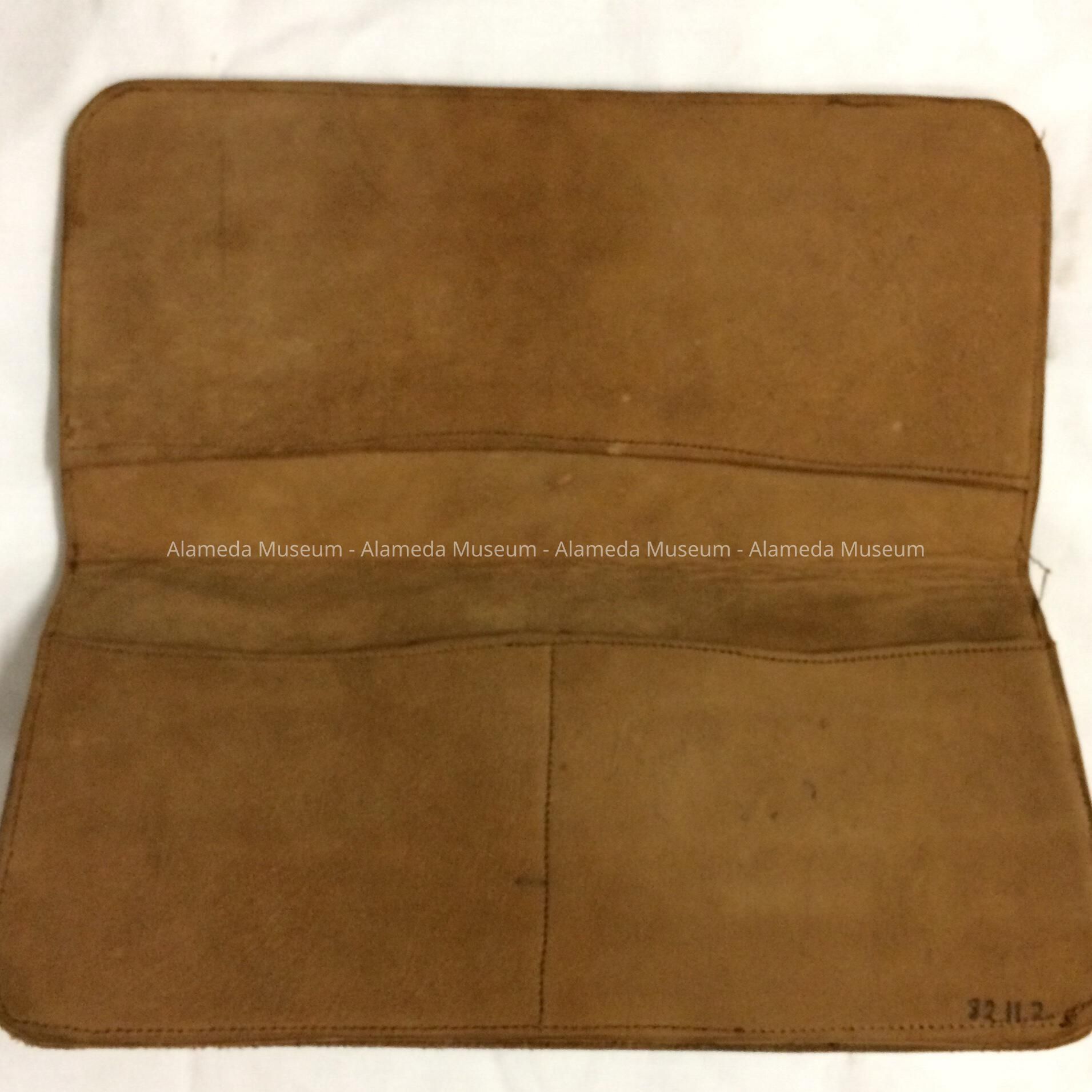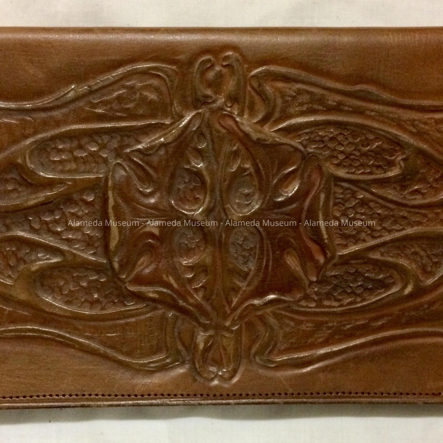History of Object: Hand tooled leather wallet made by Lura Hinsdale Smith, 1855 to 1912. Ms. Smith was an accomplished china painter, practicing her art in Alameda in the 1890's and early 1900's. She also painted in water color and oils. Beside painting and selling her wares she also taught china painting. Ms. Elizabeth Thomas, Mrs. Tilden, Mrs. Lum (the elder), Anna Spreckels were some of her students.