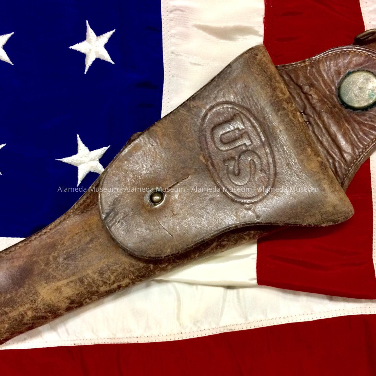 Description: A brown leather heavy duty pistol holster with a flap that covers the gun's grip with an external circular design with the letters "U.S." There is also a belt slip on the attachment.