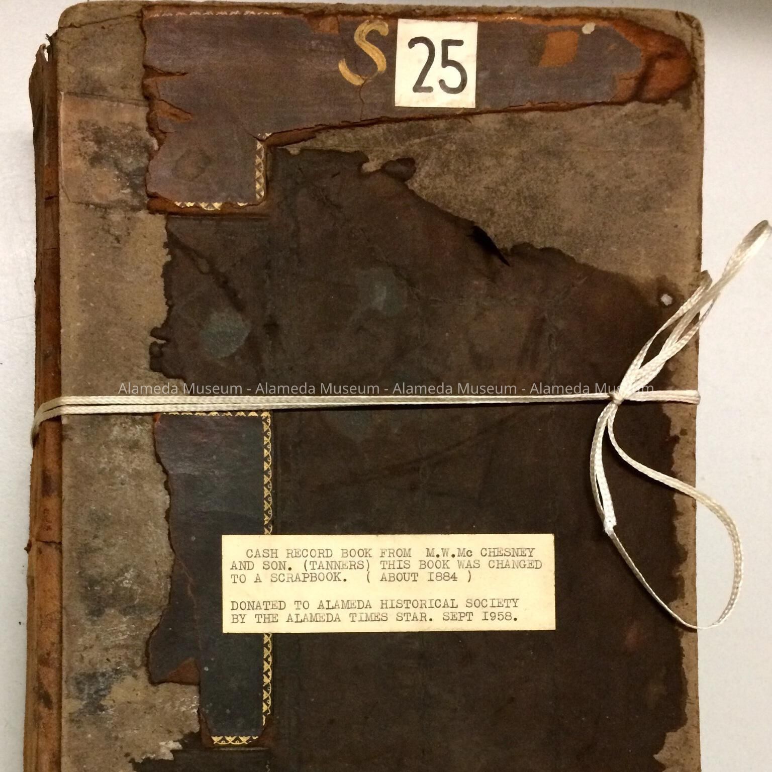 LEDGER BOOK FROM THE M W MCCHESNEY & SON, TANNERS. BOOK MADE INTO A SCRAP BOOK WHICH CONTAINS CLIPPINGS, SOME OF WHICH REFER TO ALAMEDA RESIDENTS AND CALIFORNIA PIONEERS. SCRAPBOOK, ORIGINALLY NUMBERED "S-25," WAS GIVEN TO THE ALAMEDA HISTORICAL SOCIETY AND NEVER OFFICIALLY CATALOGED.