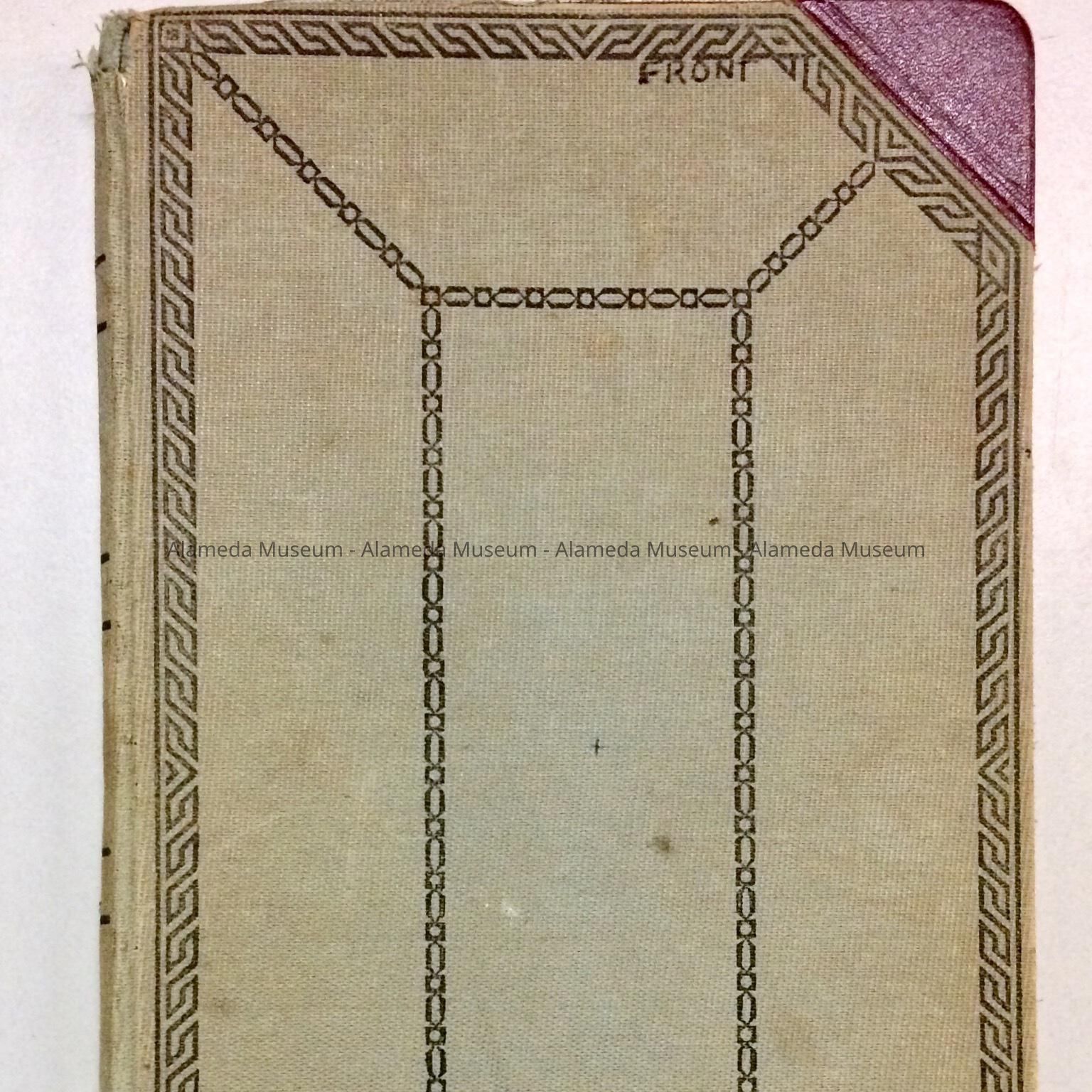 A LEDGER BOOK WITH. COVER OF GREY-COLORED BUCKRAM TRIMMED IN IMITATION 2-COLORED LEATHER.