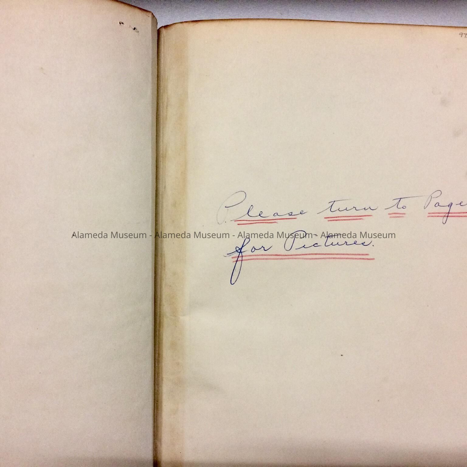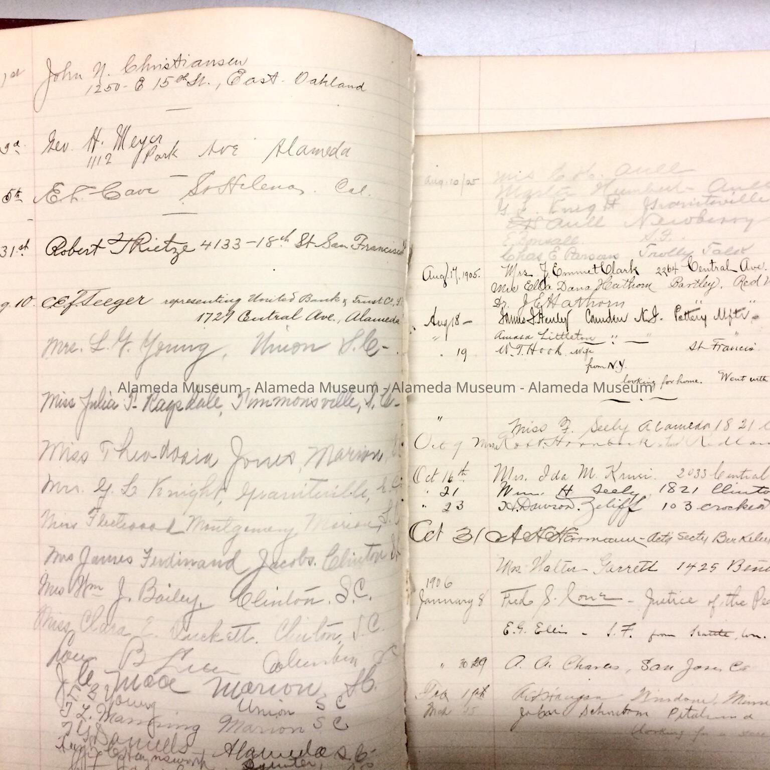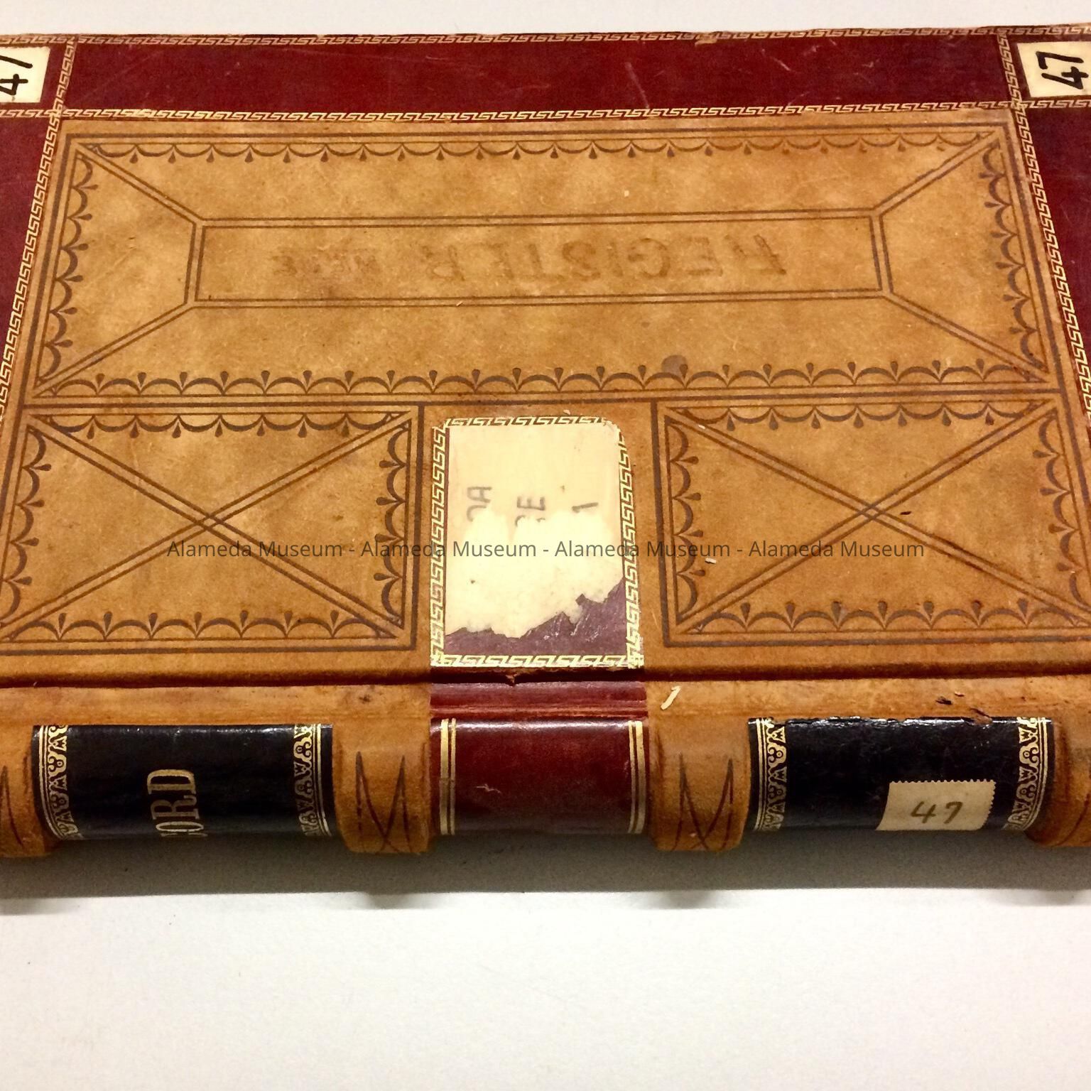 LEDGER BOOK THAT HAS BEEN USED AS A VISITORS' LOG, INCLUDING NAMES AND ADDRESSES OF EARLY ALAMEDA RESIDENTS. BOOK WAS GIVEN TO THE ALAMEDA HISTORICAL SOCIETY, NUMBERED "47," AND HERETOFORE NOT CATALOGED.