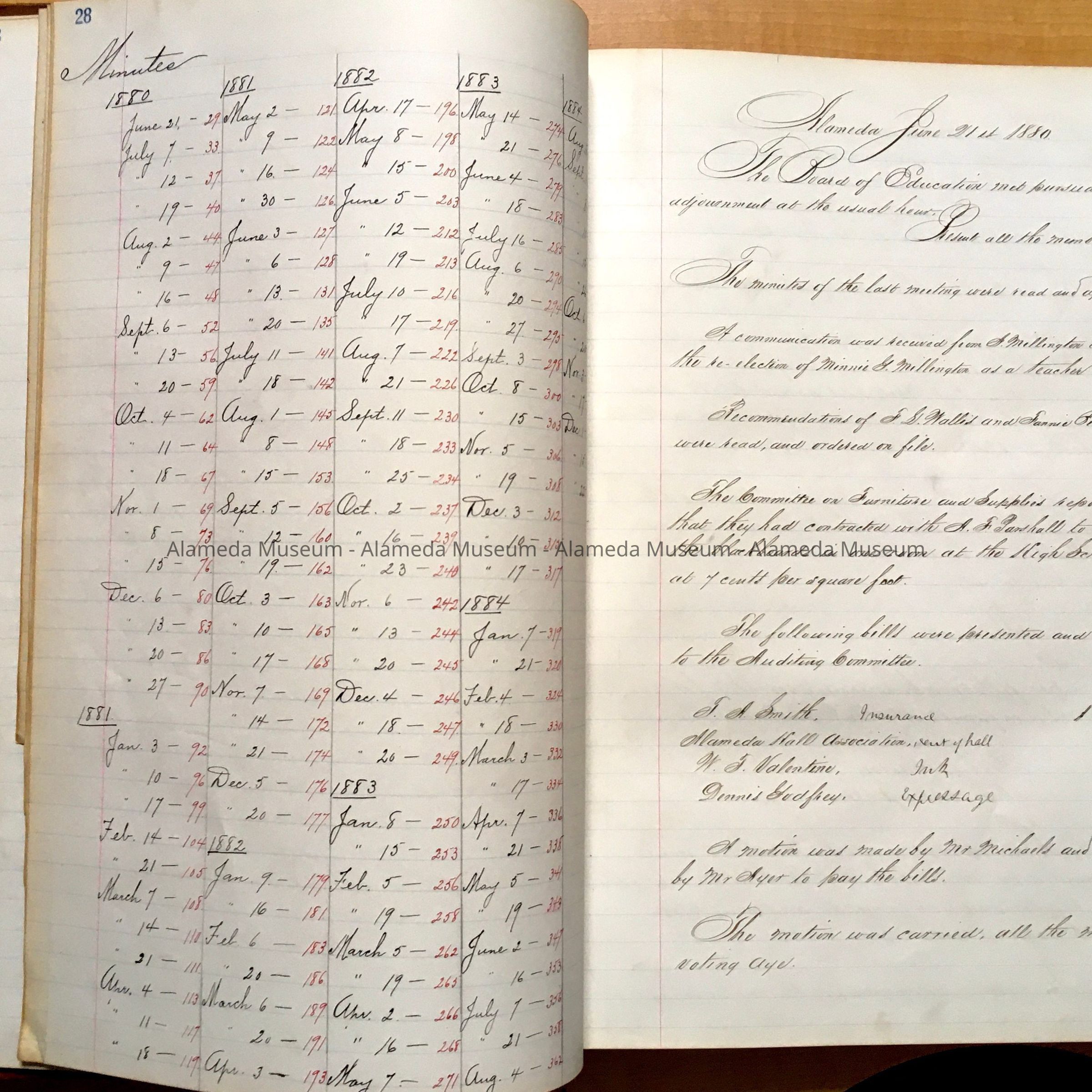 HANDWRITTEN MINUTES BY THE BOARD OF EDUCATION FROM JUNE 21, 1880 TO DECEMBER 15, 1884.