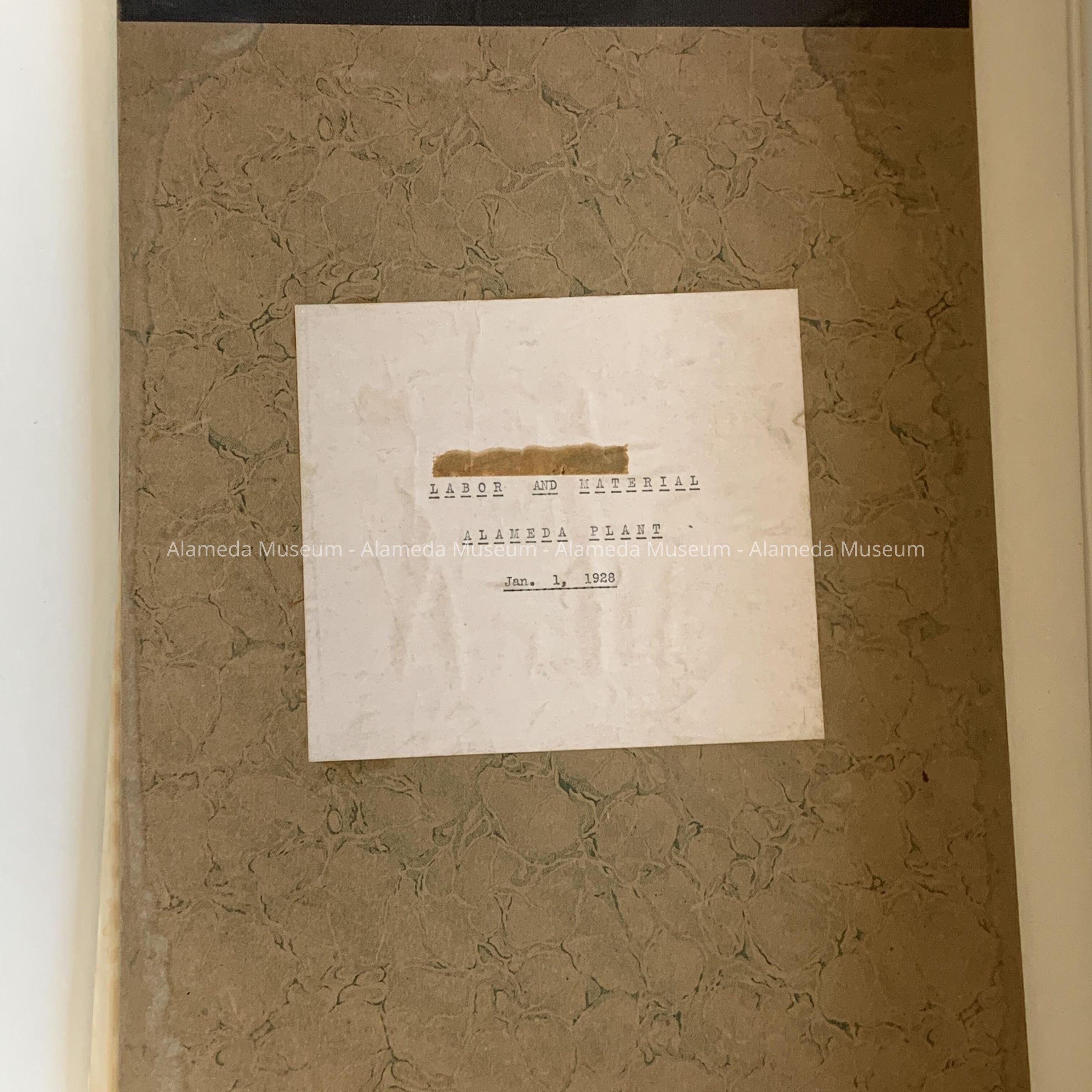 A LOOSE-LEAF LEDGER, WITH COVER DESIGN EMULATING PALE GREEN-COLORED MARBLE. TYPED CAPTION STATING, "LABOR AND MATERIAL, ALAMEDA PLANT, JANUARY 1, 1928."