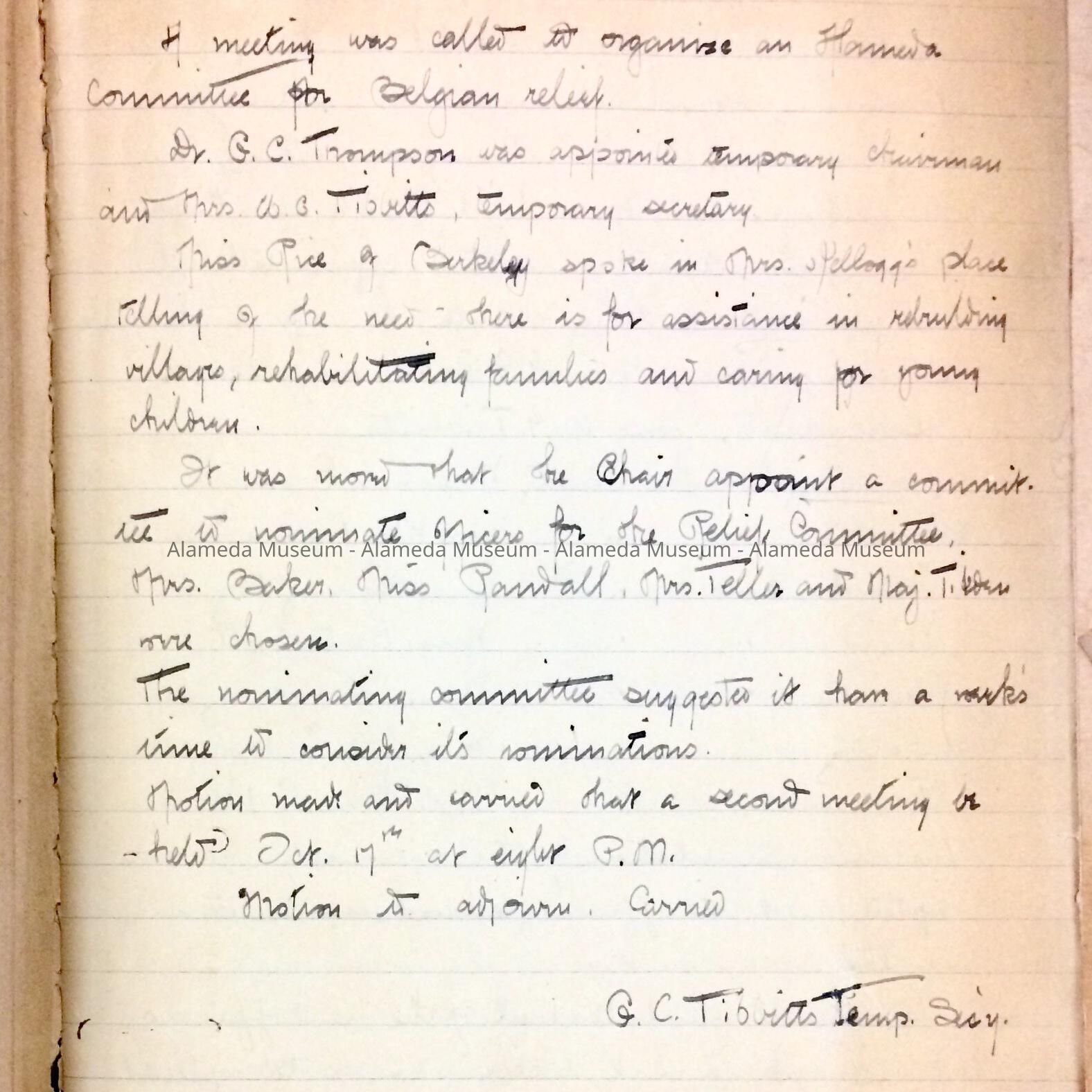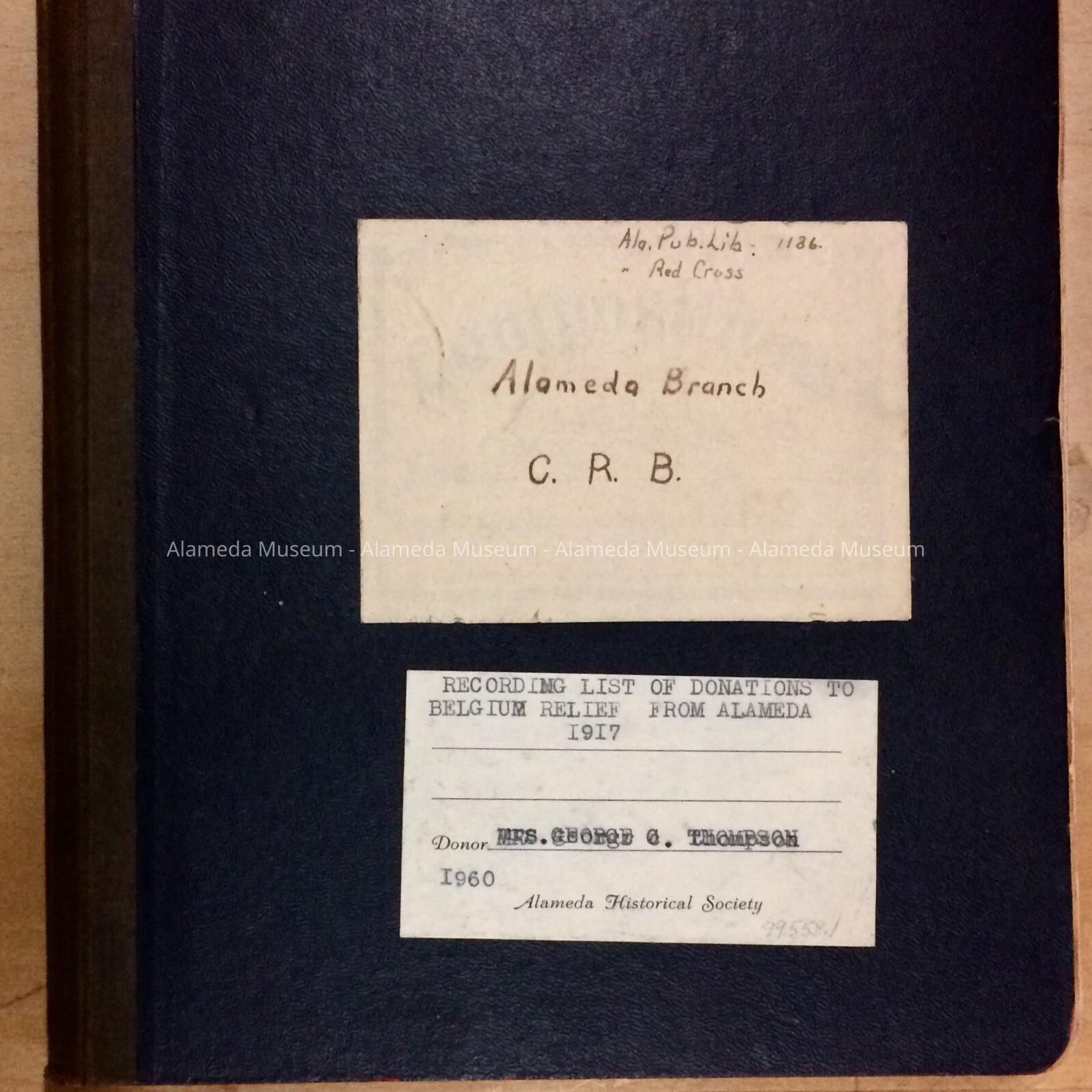 Ledger containing minutes and records of the dues and donations by members of the Alameda Committee for Belgian Relief during World War I. The ledger was donated in 1960 to the Alameda Historical Society by Mrs. George C. Thompson, wife of the principal of Alameda High School.