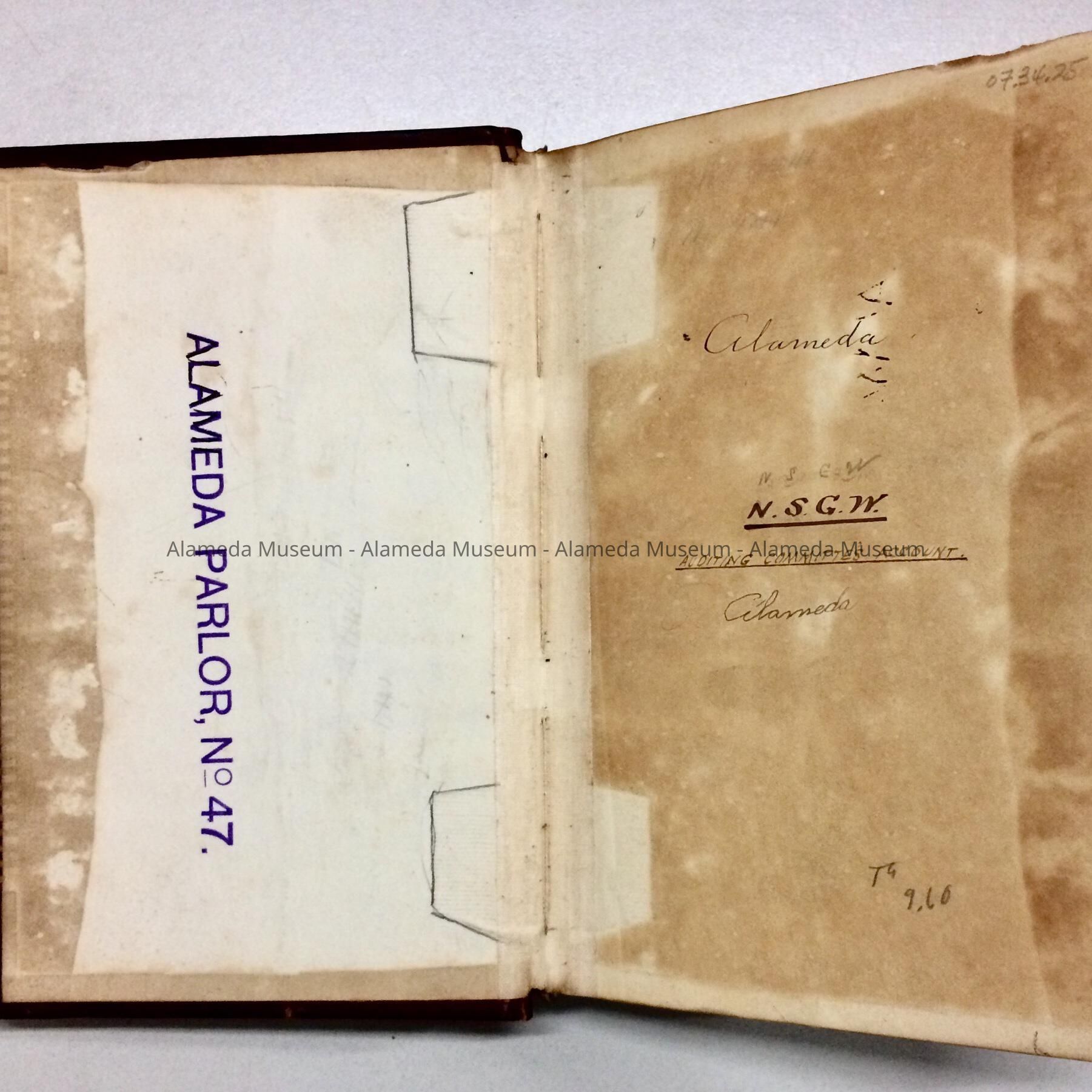 DESCRIPTION: HARD-BOUND BOOK WITH COVER OF TAN-COLORED EMBOSSED LEATHER, TRIMMED IN WINE-COLORED LEATHER AND GOLD ACCENTS. SPINE READS, "RECORD, ALAMEDA PARLOR NO. 47, AUDITING COM." CONTENTS ARE HANDWRITTEN ENTRIES.