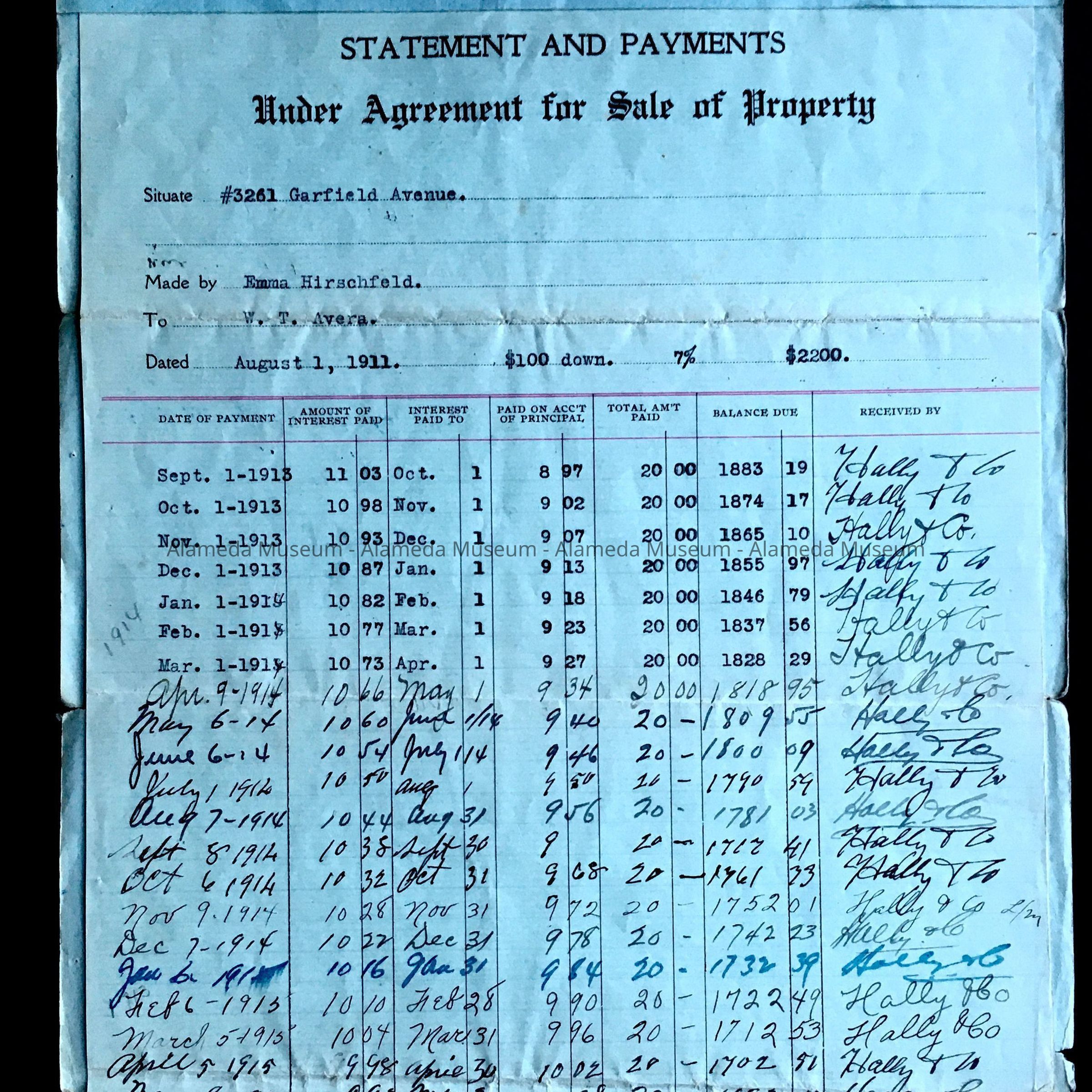 History of Object: Ledger pages (Holly & Co.) showing house payments from August 1, 1911 to April 3, 1916, on 3261 Garfield Avenue.