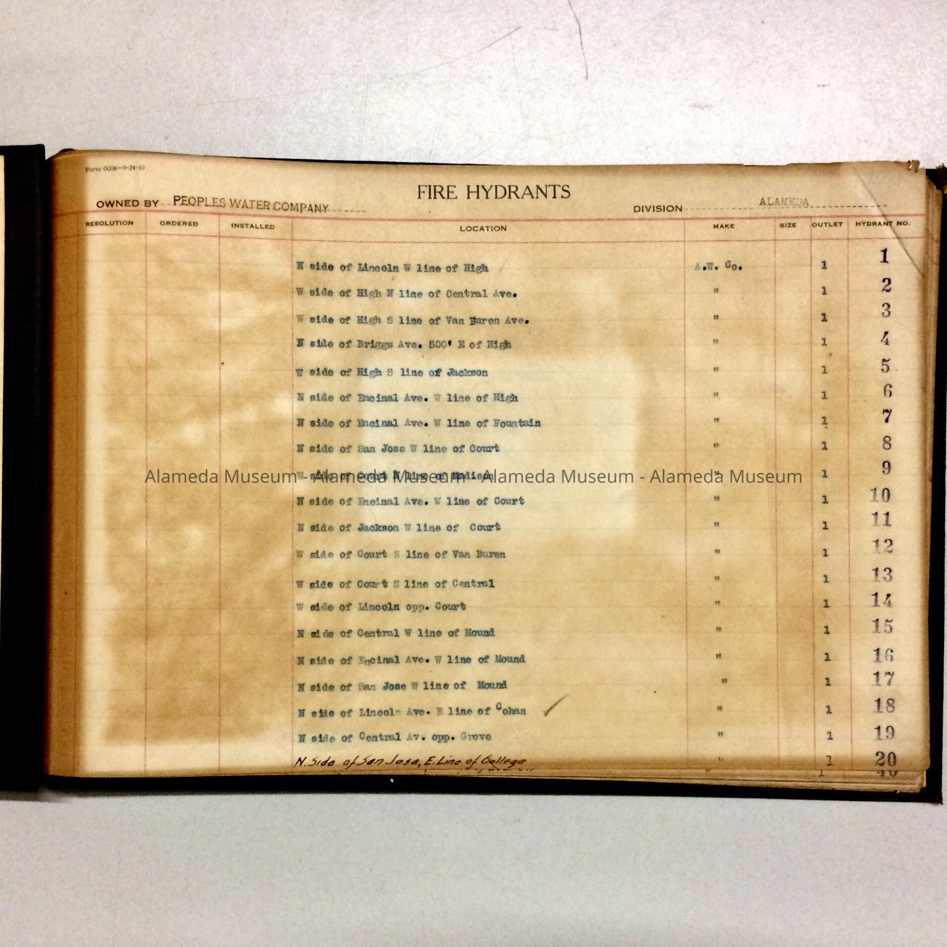 History of Object: Inventory of fire hydrants in city of Alameda, in some cases includes installation dates. Lists owner of hydrant as the “peoples water comp” which was absorbed by the East Bay Water Company.