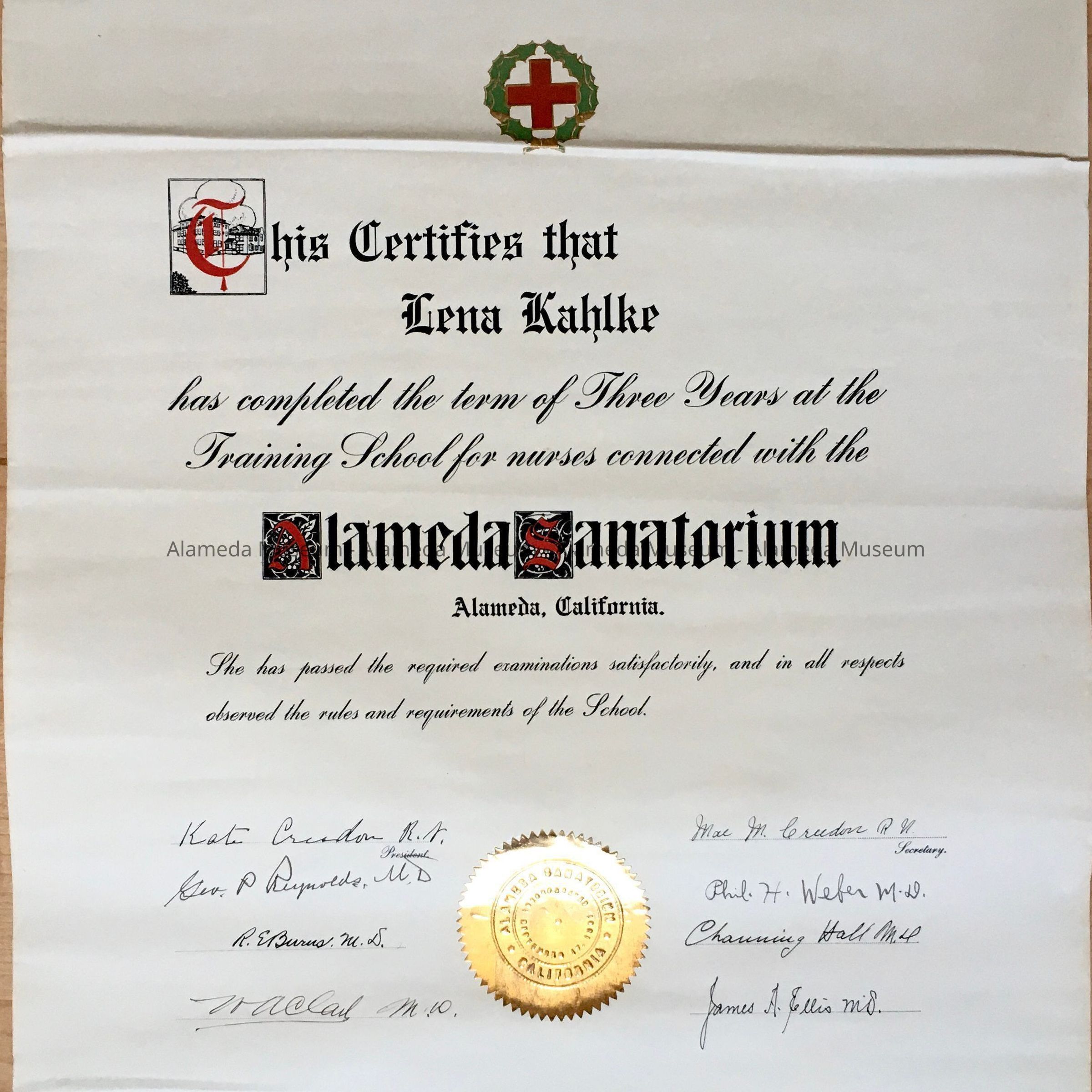 Description: Diploma with ornate type, gold Alameda Sanatorium seal, and bold heading "This Certifies That Lena Kahlke […]." At top an emblem consisting of a red cross surrounded by a green colored laurel wreath. Signed by Kate Creedon. The first capital letter (T) is of a gothic font, red, and decorated with two buildings.