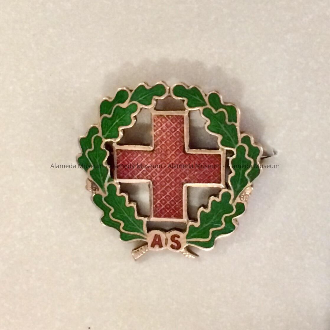 Description: Gold & enamel pin consisting of a central cross (red enameling) surrounded by a circular laurel wreath (green enameling) & the letters "A.S. ". On the reverse side stamped "Clarke (manufacturer) & engraved "L. Kahlke, 3-28-21."