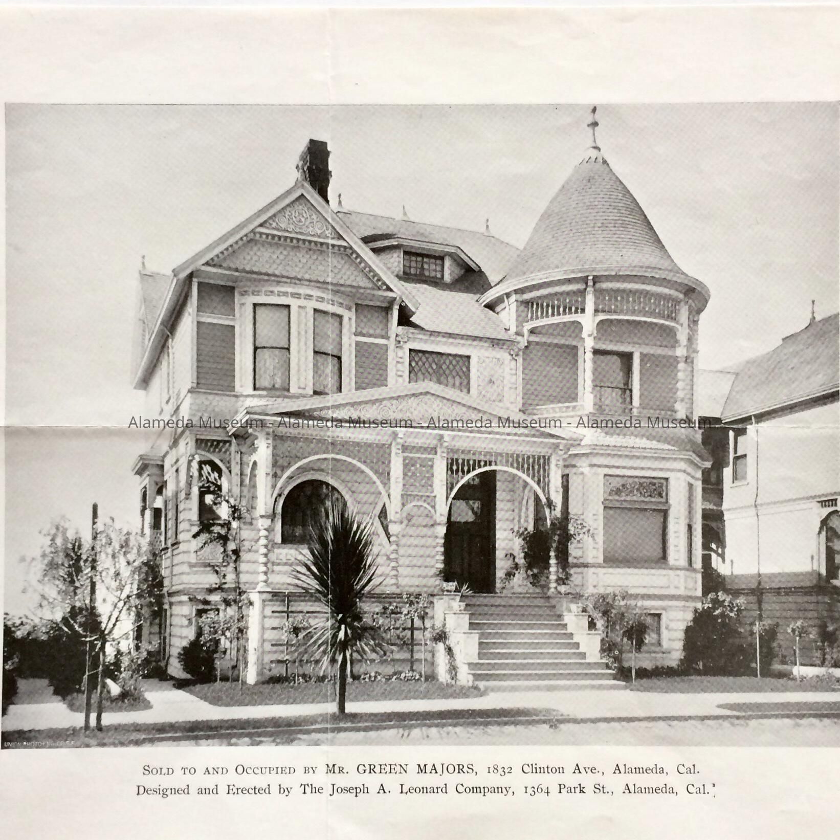 HISTORY OF OBJECT: ILLUSTRATED ADVERTISING CIRCULAR, FOR THE JOSEPH A. LEONARD COMPANY, BUILDERS. AT THE BOTTOM OF THE PHOTO OF THIS QUEEN ANNE RESIDENCE, IS PRINTED, SOLD TO AND OCCUPIED BY MR. GREEN MAJORS, 1823 CLINTON AVE., ALAMEDA CAL. DESIGNED AND ERECTED BY THE JOSEPH A. LEONARD COMPANY, 1364 PARK ST., ALAMEDA, CAL.