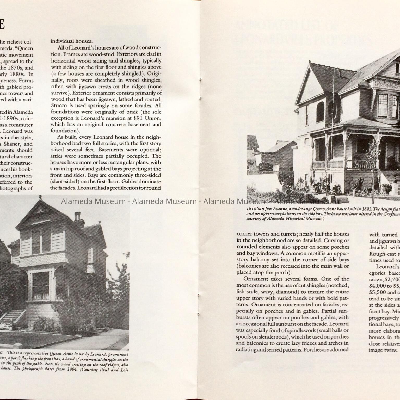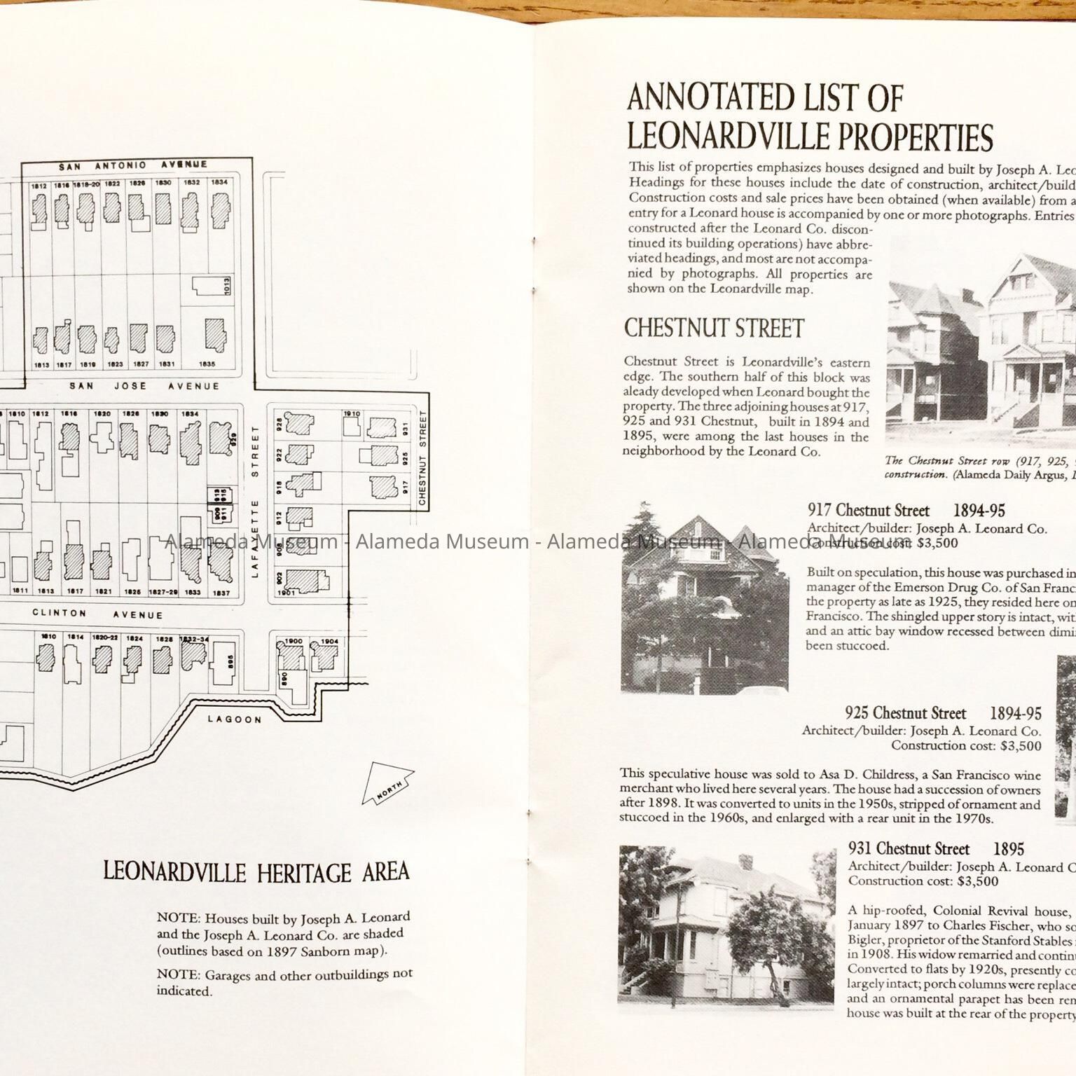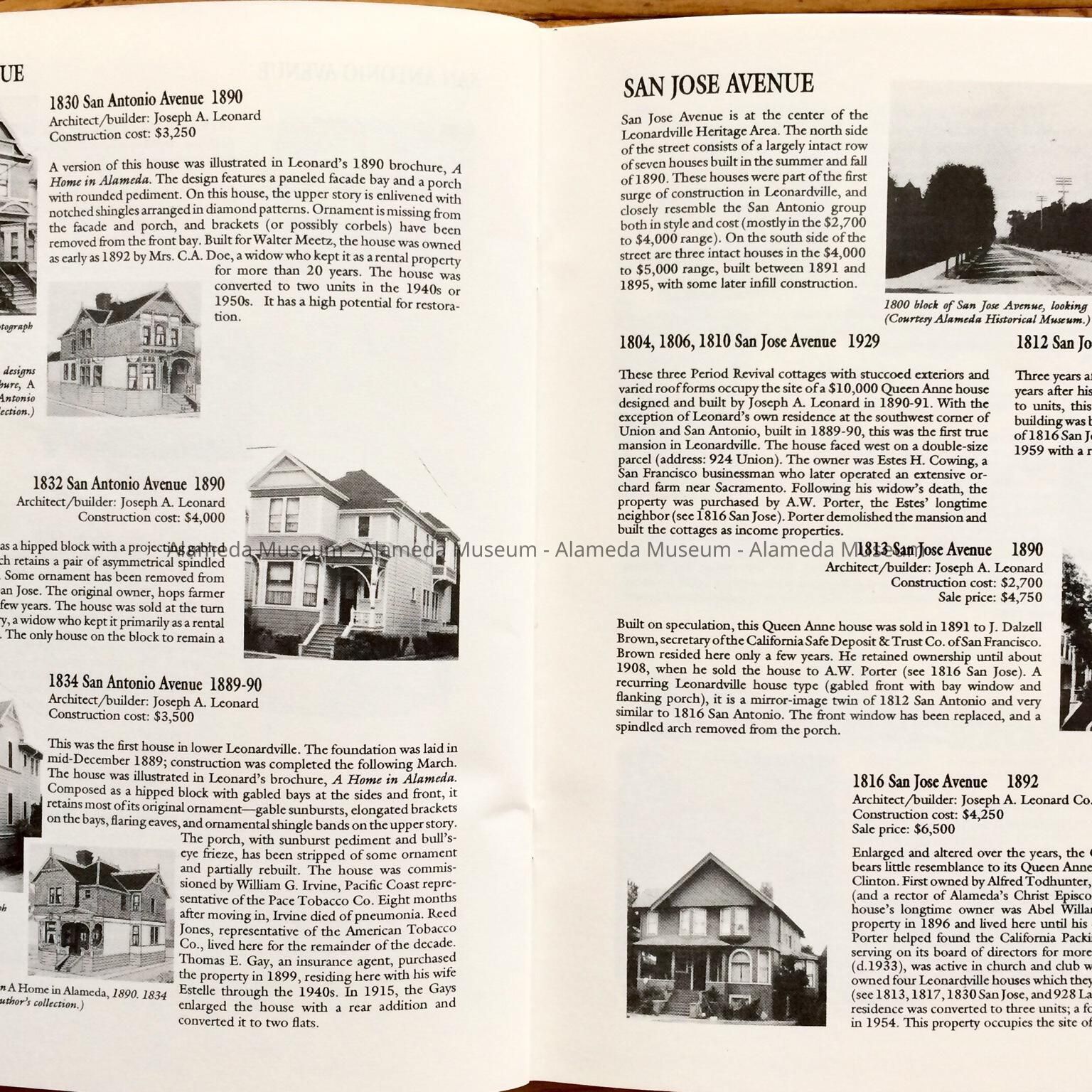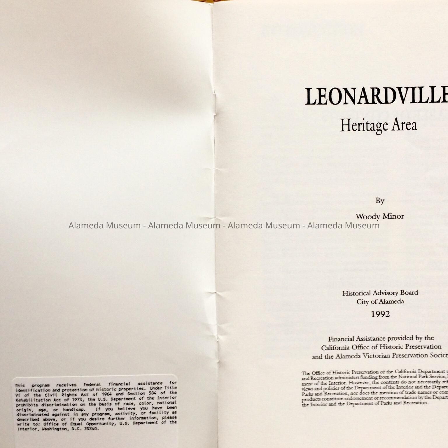 HISTORY OF OBJECT: A BOOKLET TITLED, "LEONARDVILLE, A HERITAGE AREA," BY WOODY MINOR THROUGH THE HISTORICAL ADVISORY BOARD, CITY OF ALAMEDA, 1992. THE AUTHOR WRITES ABOUT THE VICTORIAN BUILDER JOSEPH A. LEONARD AND THE HOMES HE CONSTRUCTED IN THE VICINITY OF SAINT JOSEPH CATHOLIC CHURCH.