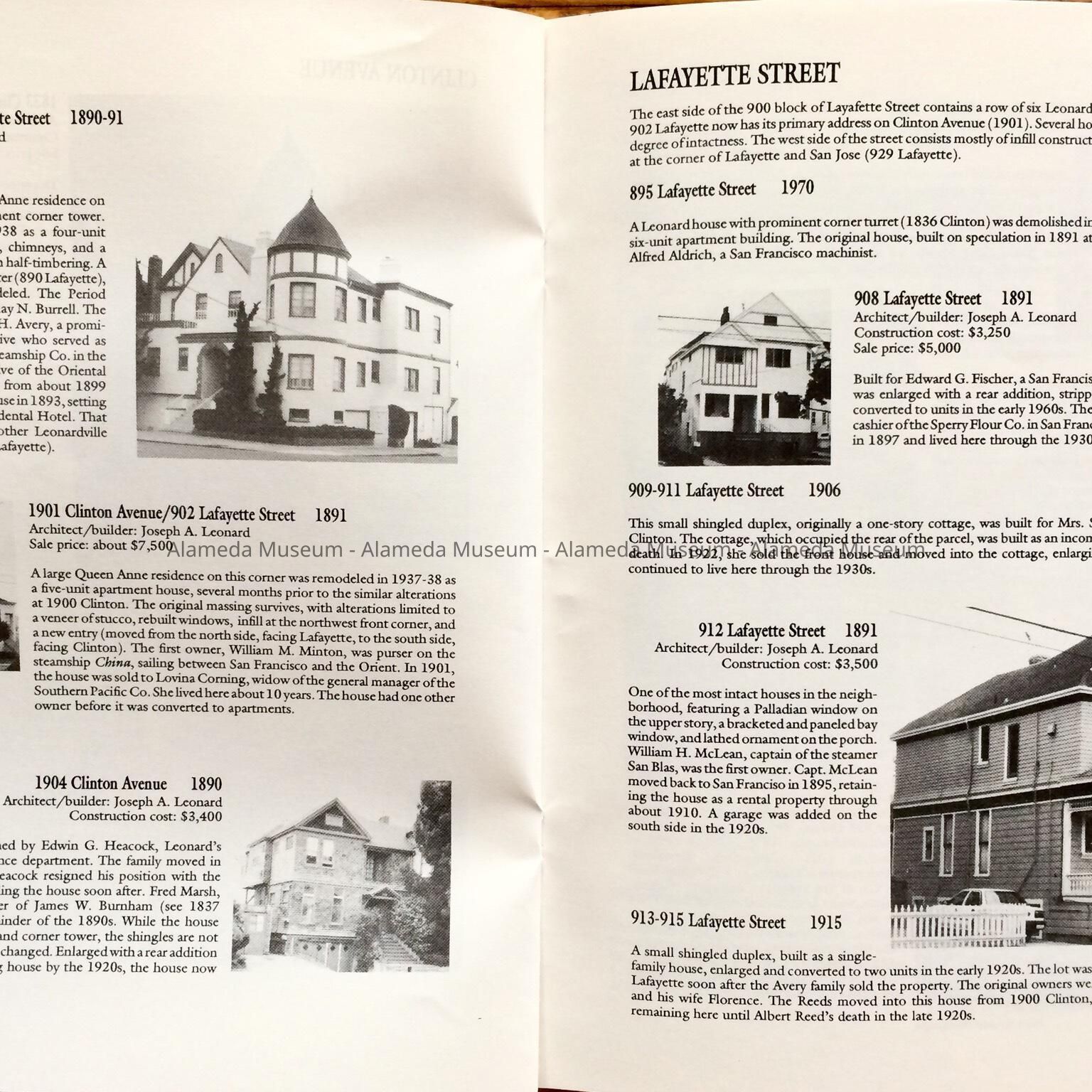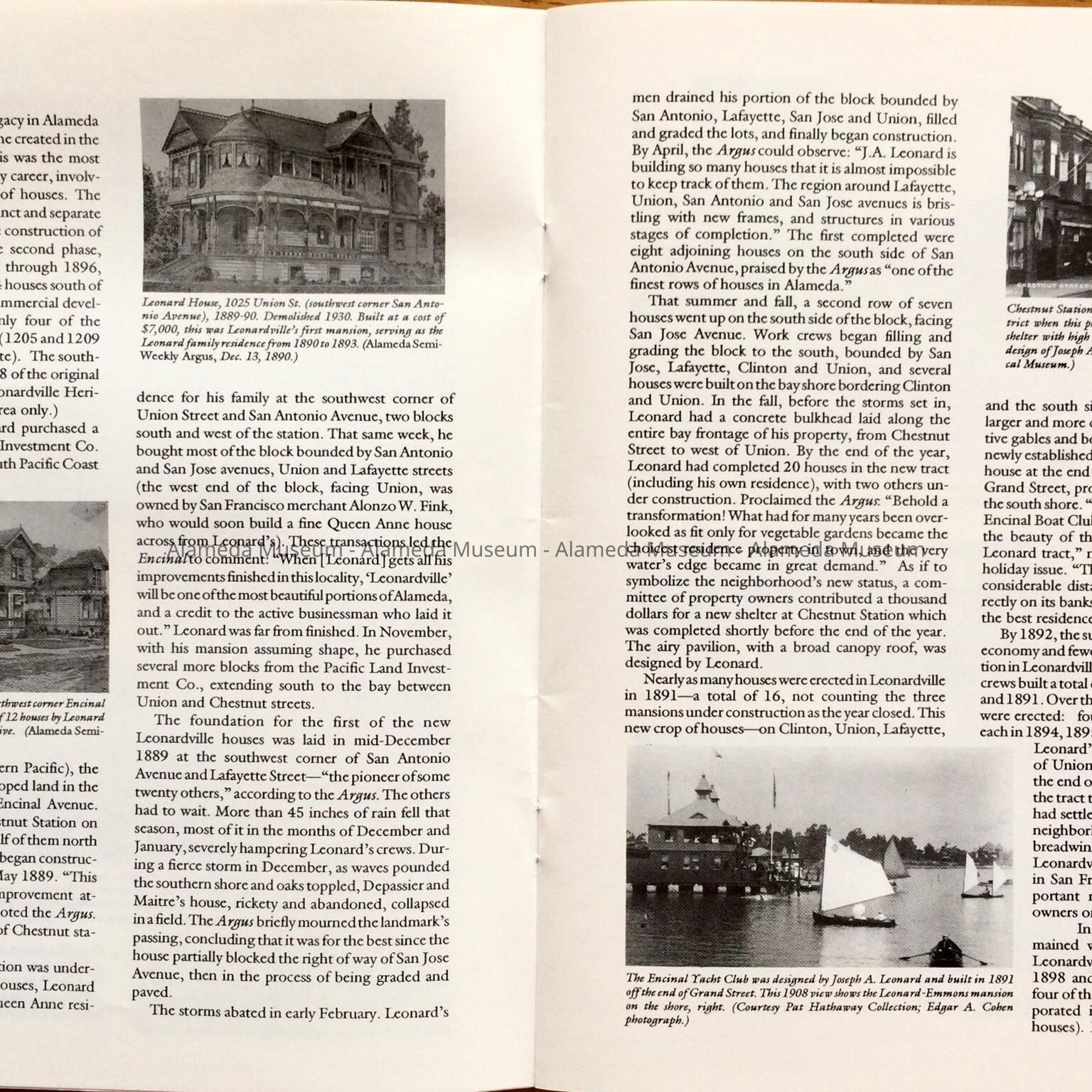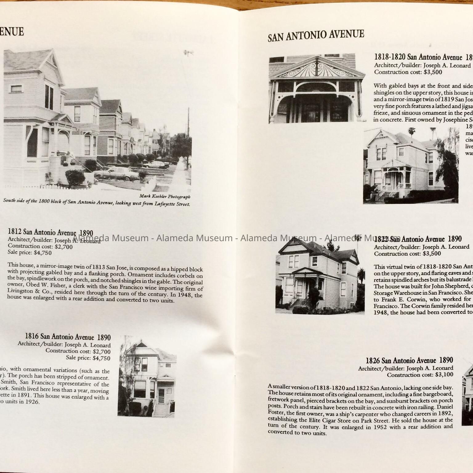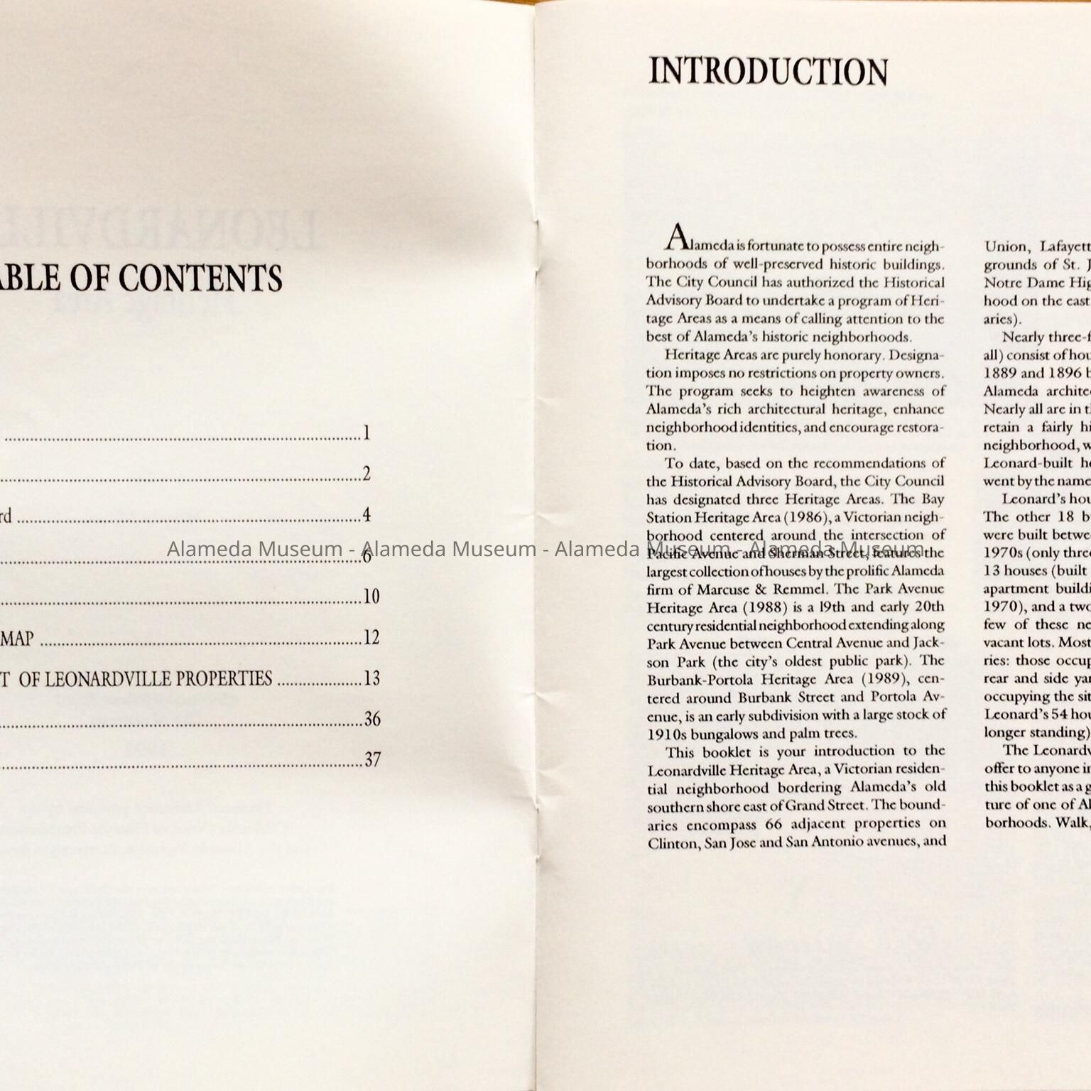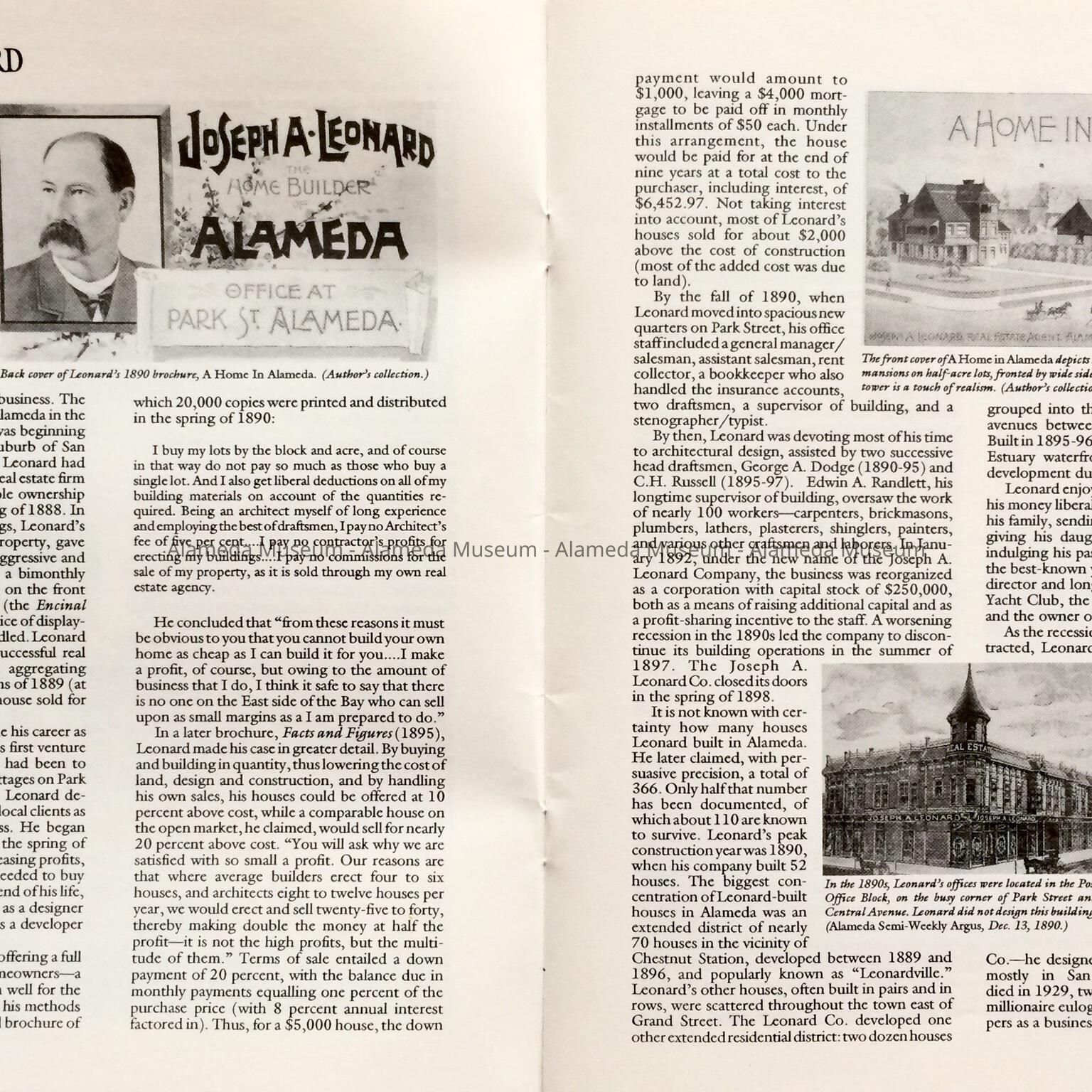 HISTORY OF OBJECT: A BOOKLET TITLED, "LEONARDVILLE, A HERITAGE AREA," BY WOODY MINOR THROUGH THE HISTORICAL ADVISORY BOARD, CITY OF ALAMEDA, 1992. THE AUTHOR WRITES ABOUT THE VICTORIAN BUILDER JOSEPH A. LEONARD AND THE HOMES HE CONSTRUCTED IN THE VICINITY OF SAINT JOSEPH CATHOLIC CHURCH.