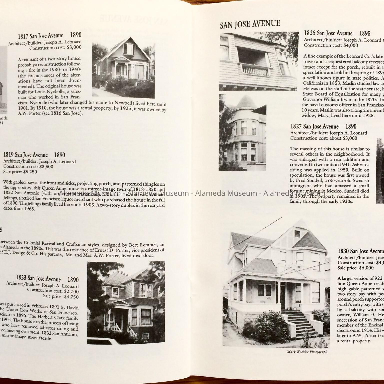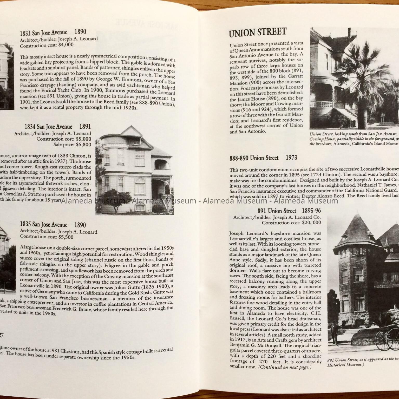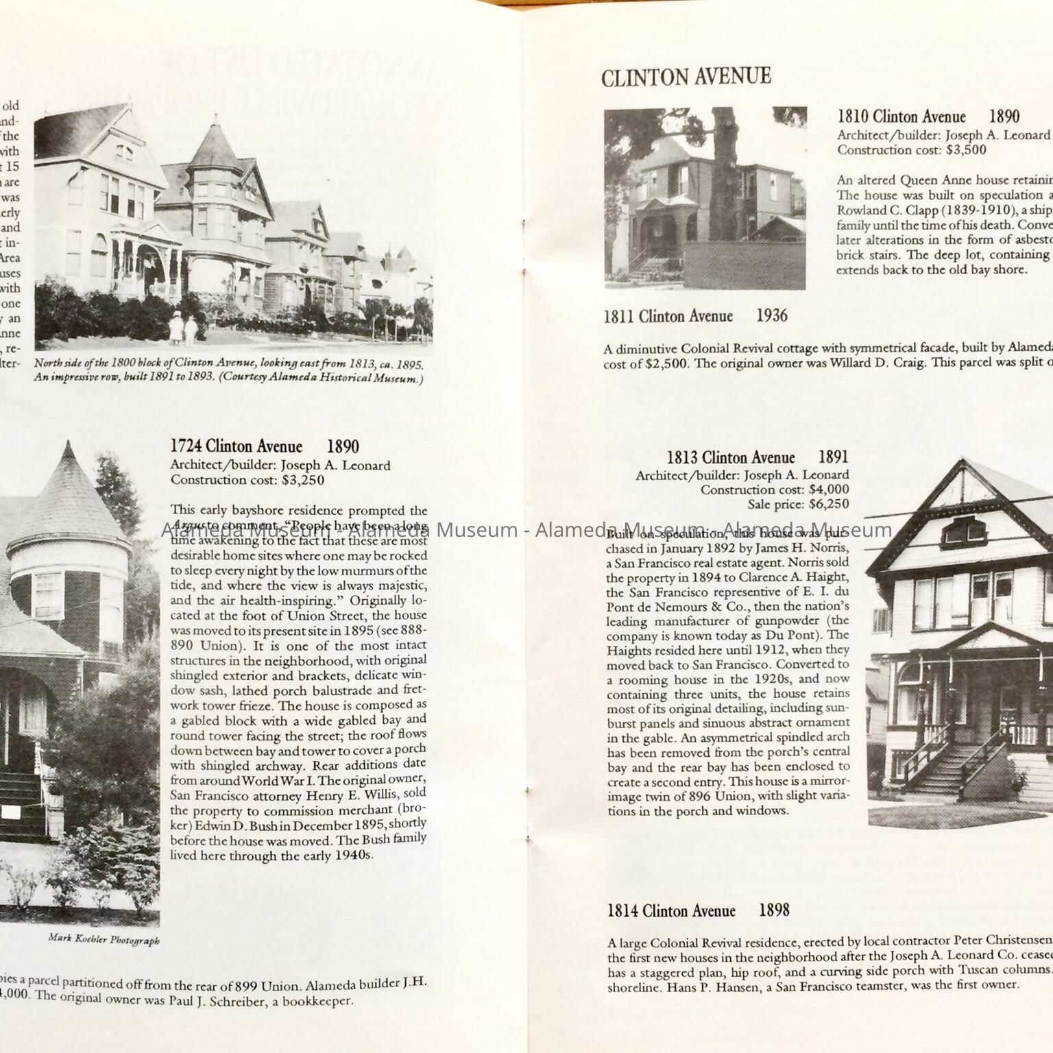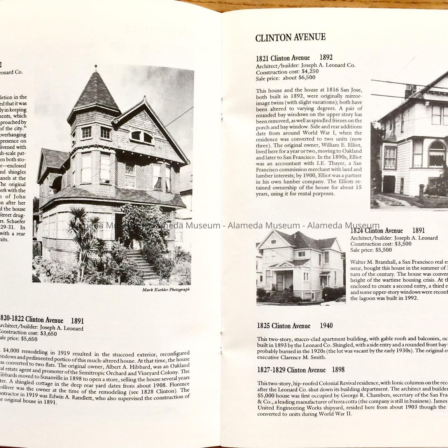HISTORY OF OBJECT: A BOOKLET TITLED, "LEONARDVILLE, A HERITAGE AREA," BY WOODY MINOR THROUGH THE HISTORICAL ADVISORY BOARD, CITY OF ALAMEDA, 1992. THE AUTHOR WRITES ABOUT THE VICTORIAN BUILDER JOSEPH A. LEONARD AND THE HOMES HE CONSTRUCTED IN THE VICINITY OF SAINT JOSEPH CATHOLIC CHURCH.