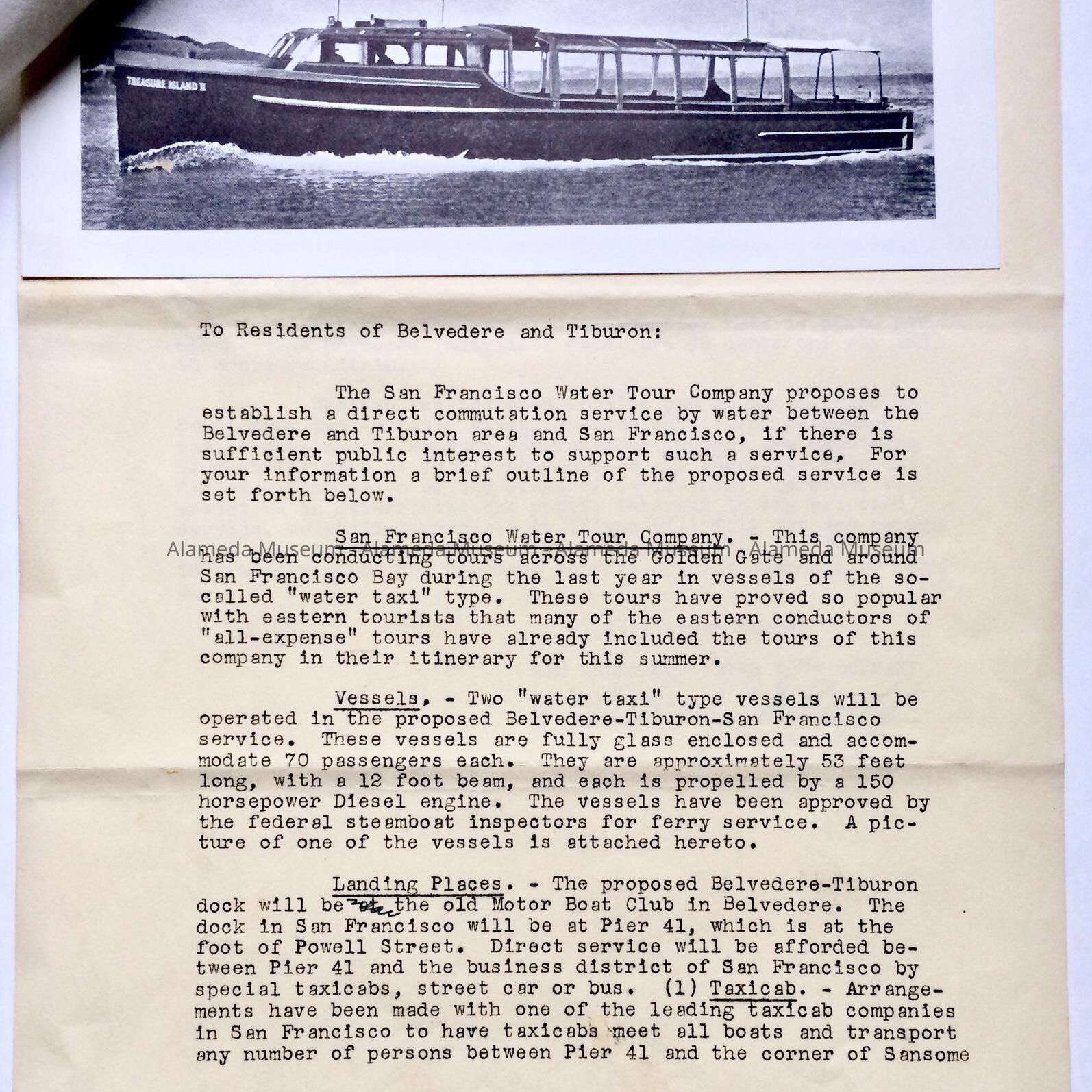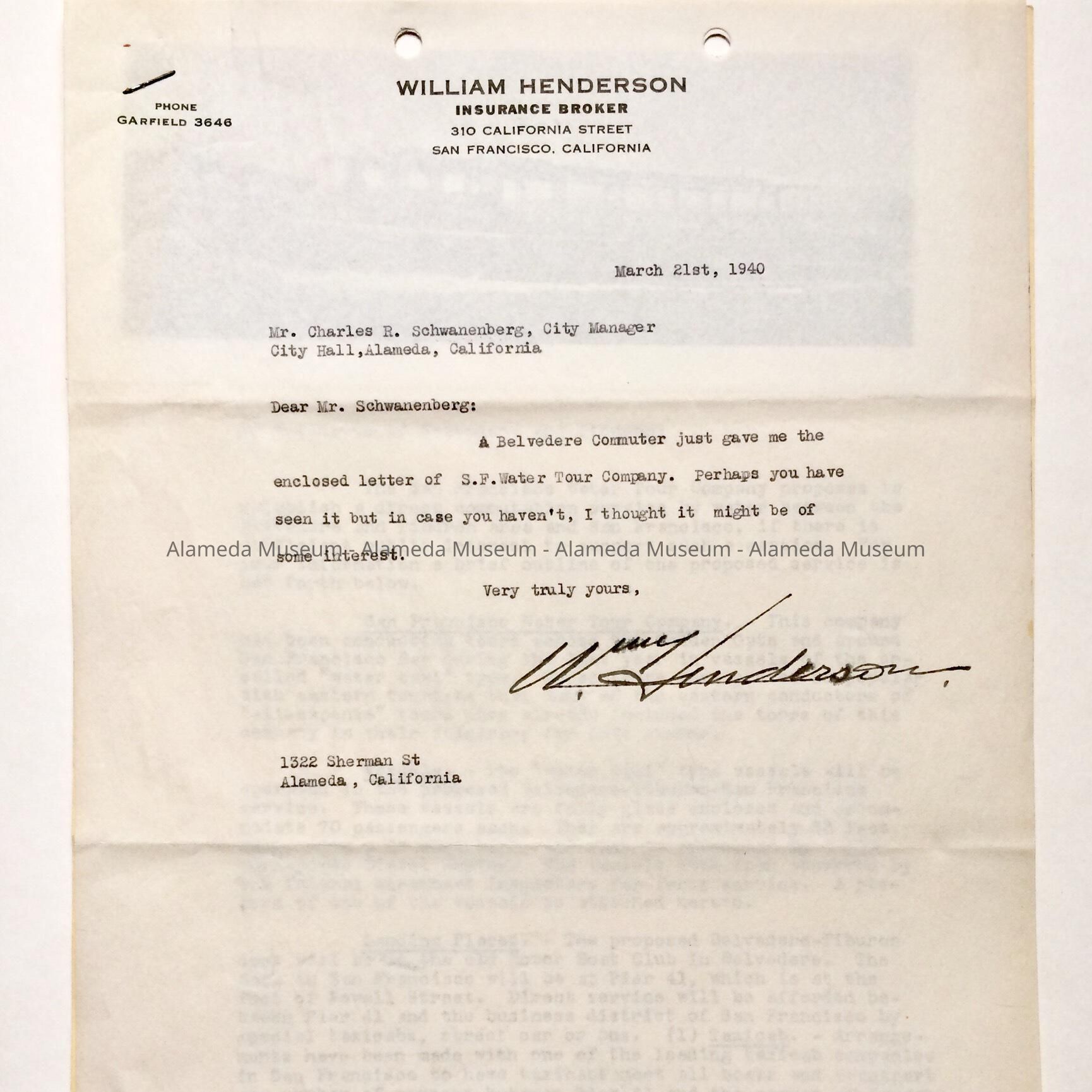 HISTORY OF OBJECT: A LETTER ADDRESSED TO CHARLES R. SCHWANENBERG, CITY MANAGER, DATED MARCH 21, 1940, CONCERNING A WATER TAXI SERVICE PROVIDED BY THE SAN FRANCISCO WATER TOUR COMPANY. THE LETTER WAS SIGNED BY WILLIAM HENDERSON, INSURANCE BROKER, WHO RESIDED AT 1322 SHERMAN STREET, ALAMEDA.