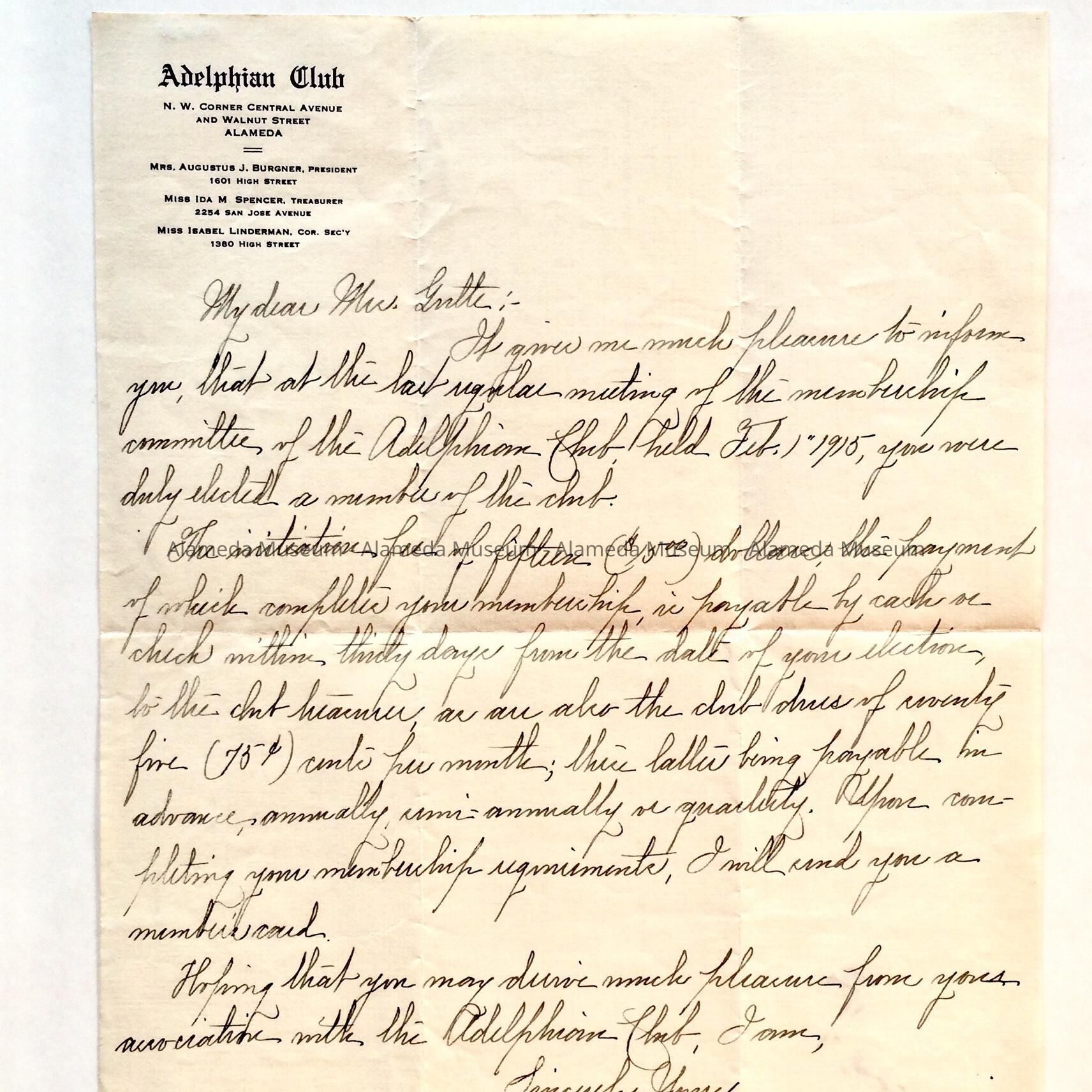 A LETTER ADDRESSED TO MRS GUTTE, NOTIFYING HER OF HER MEMBERSHIP TO THE ADELPHIAN CLUB. LETTER IS SIGNED BY ISABELLE LINDERMAN. MRS GUTTE WAS DAUGHTER OF CARL H CLARK. SHE WAS GREAT GRANDMOTHER OF THE LATE JACK GUTTE, WHO WAS A PROFESSIONAL PHOTOGRAPHER. THE GUTTES RESIDED ON LINCOLN AVENUE NEAR HIGH STREET IN ALAMEDA. MRS GUTTE'S GRANDMOTHER WAS LOUISE CLARK, WHOSE COLLECTION IS BEING CATALOGED IN THE ALAMEDA MUSEUM.