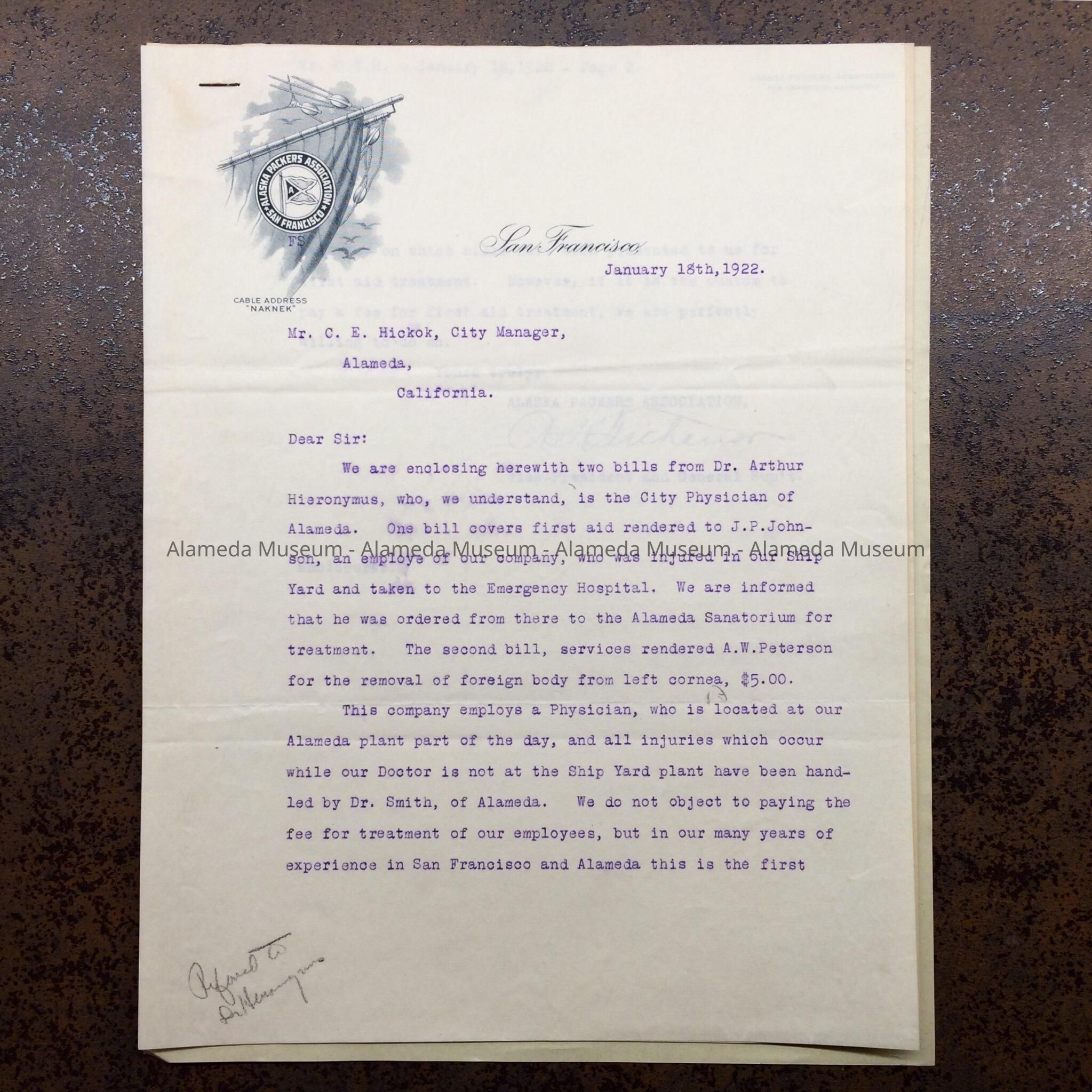 Letter about an injured employee of the Alaska Packers, 1922Entry/Object ID