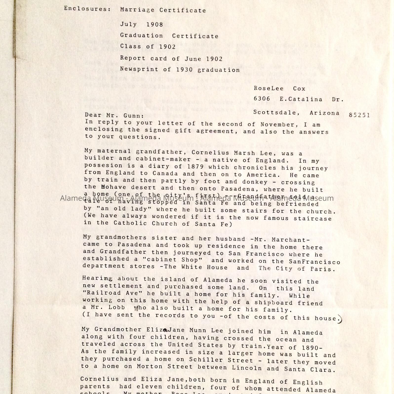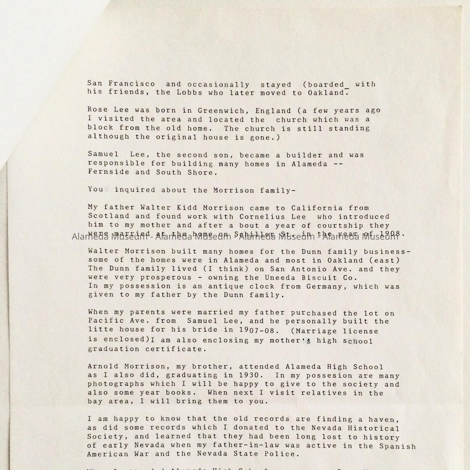 HISTORY OF OBJECT: A LETTER WHERE THE DONOR PRESENTS INFORMATION ON HER MATERNAL GRANDFATHER, CORNELIUS MARSH LEE, AN EARLY BUILDER AND RESIDENT OF ALAMEDA.