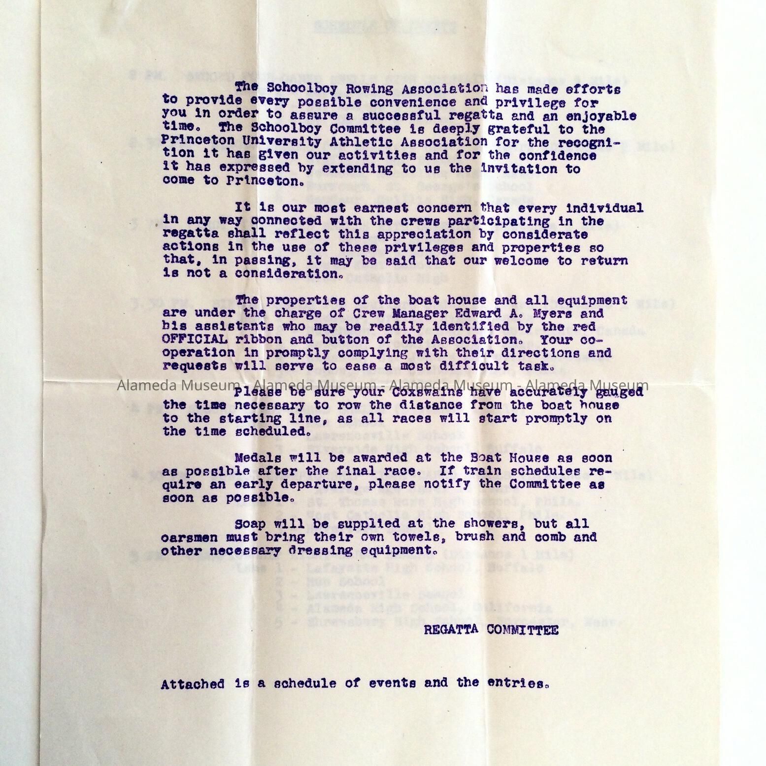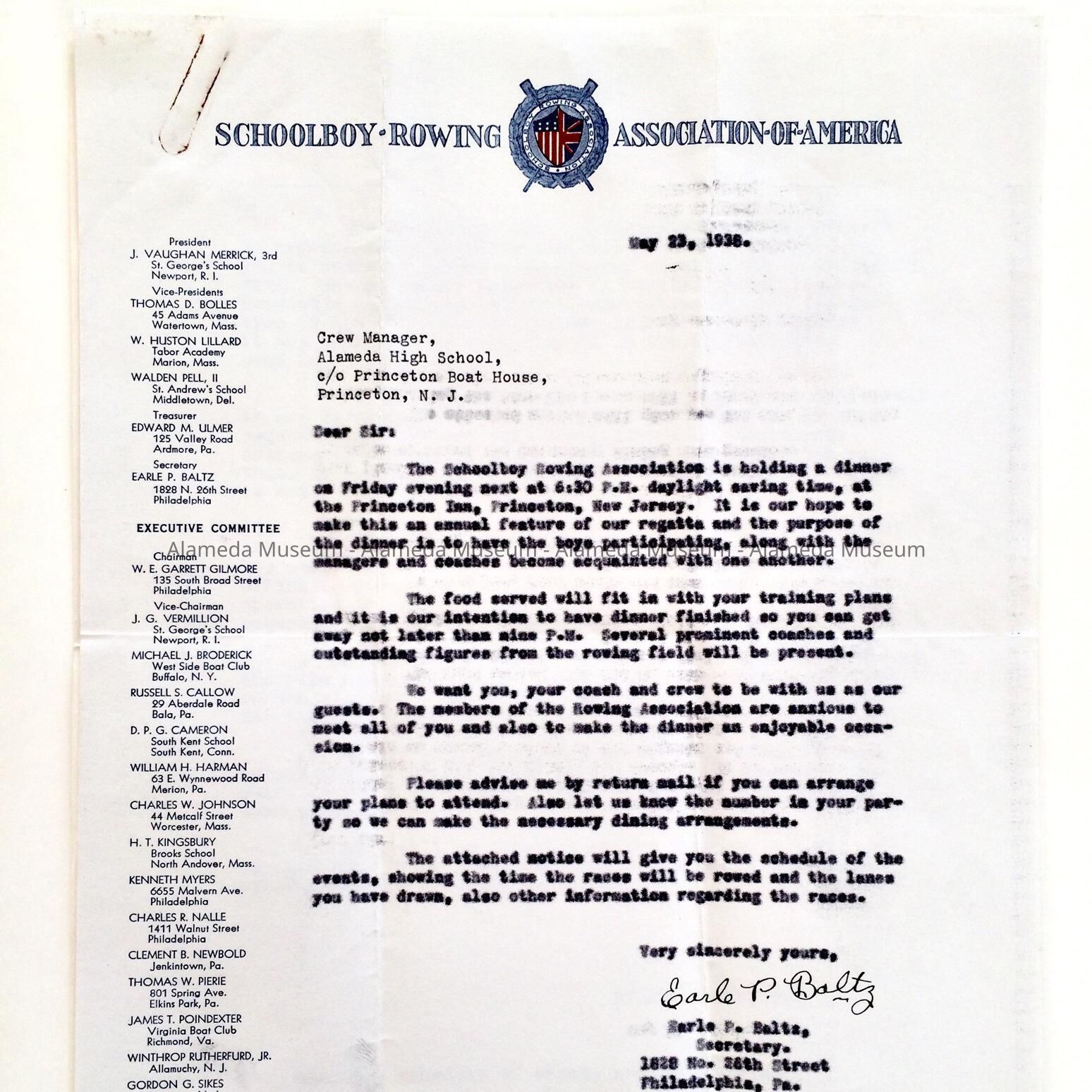 A TYPEWRITTEN LETTER. LETTERHEAD STATES "SCHOOL BOYS ROWING ASSOCIATION OF AMERICA."