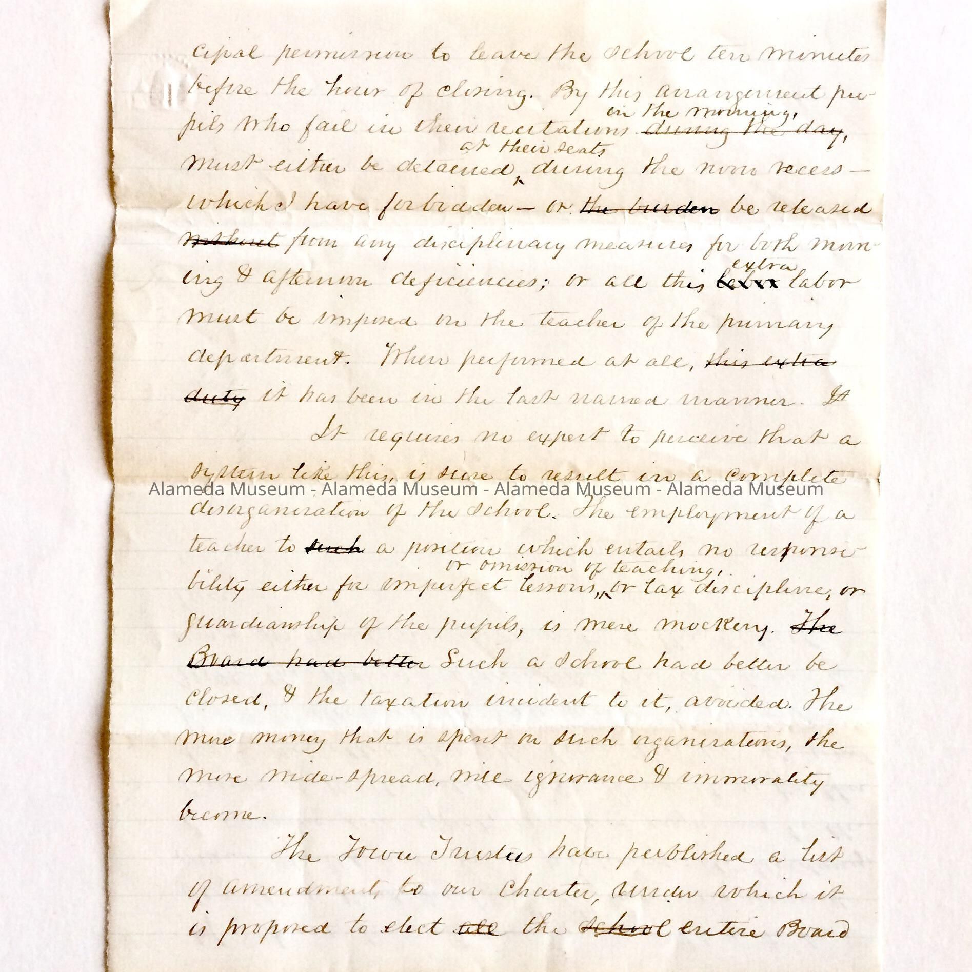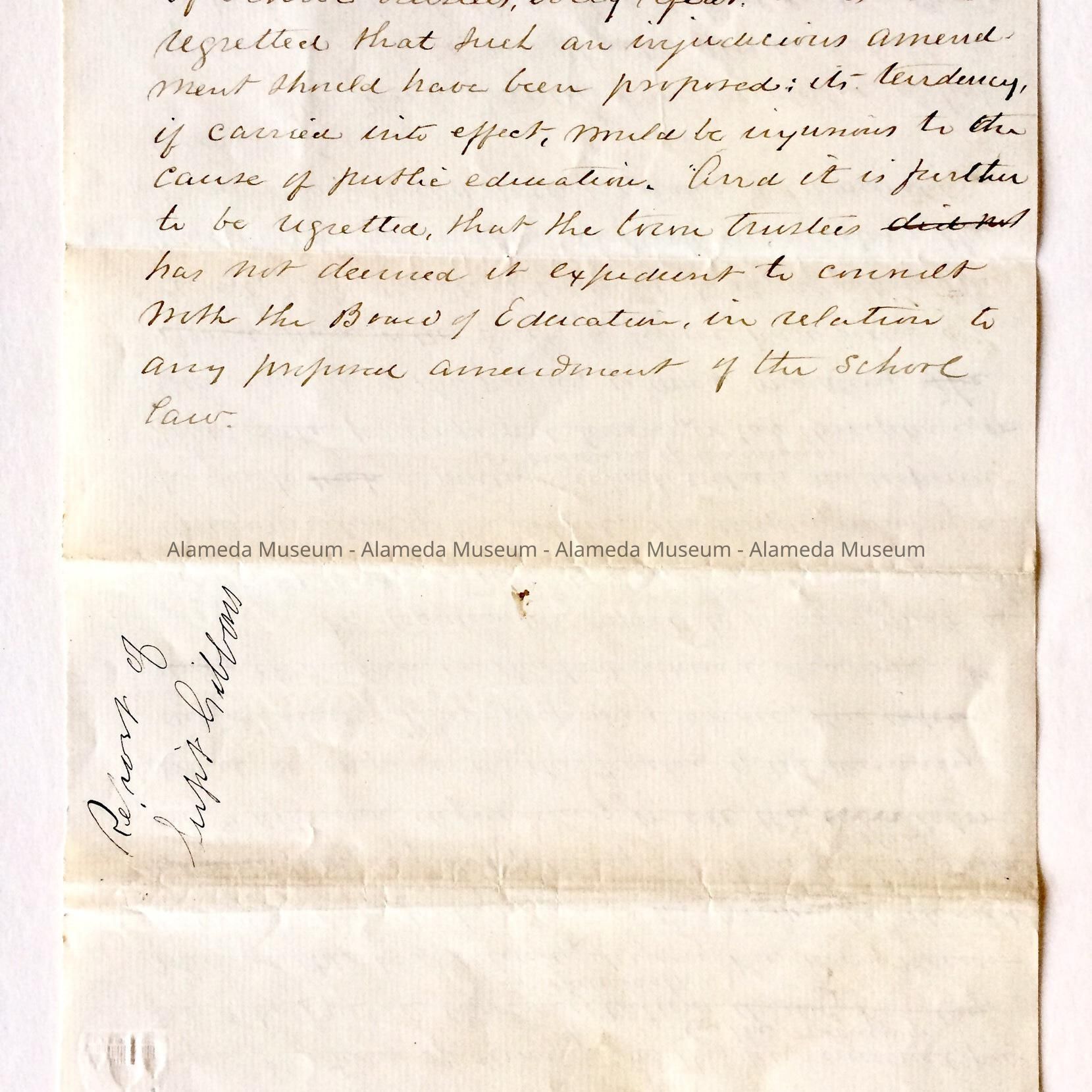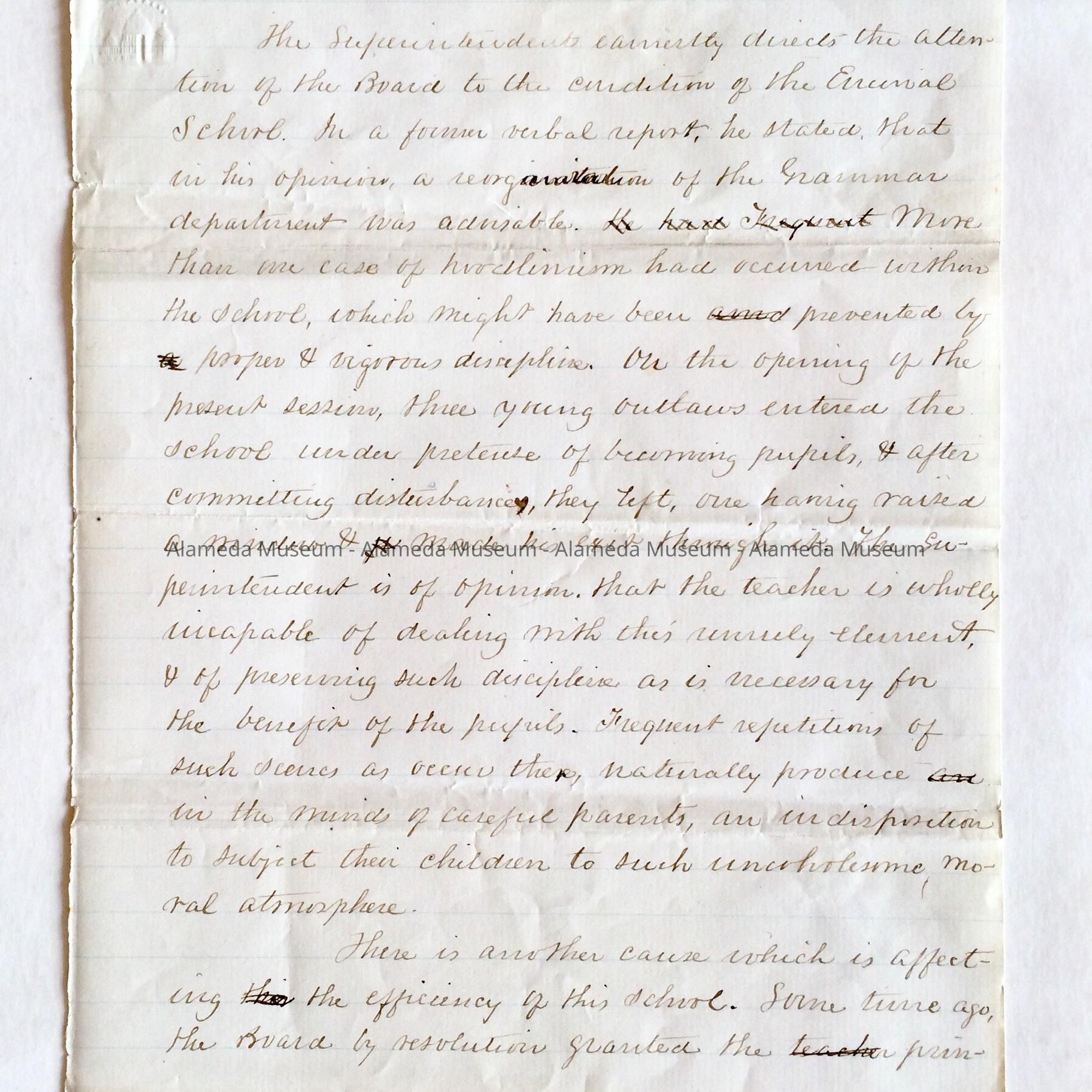 Letter written by Superintendent of Schools Gibbons of the Board of Education to the Board of Trustees concerning disciplinary conditions at the Encinal School (which would later become Mastick). This collection of documents was given to the Alameda Historical Society in 1960 and never catalogued. They were donated by the then Superintendent of Schools, Dr. Donald Roderick.