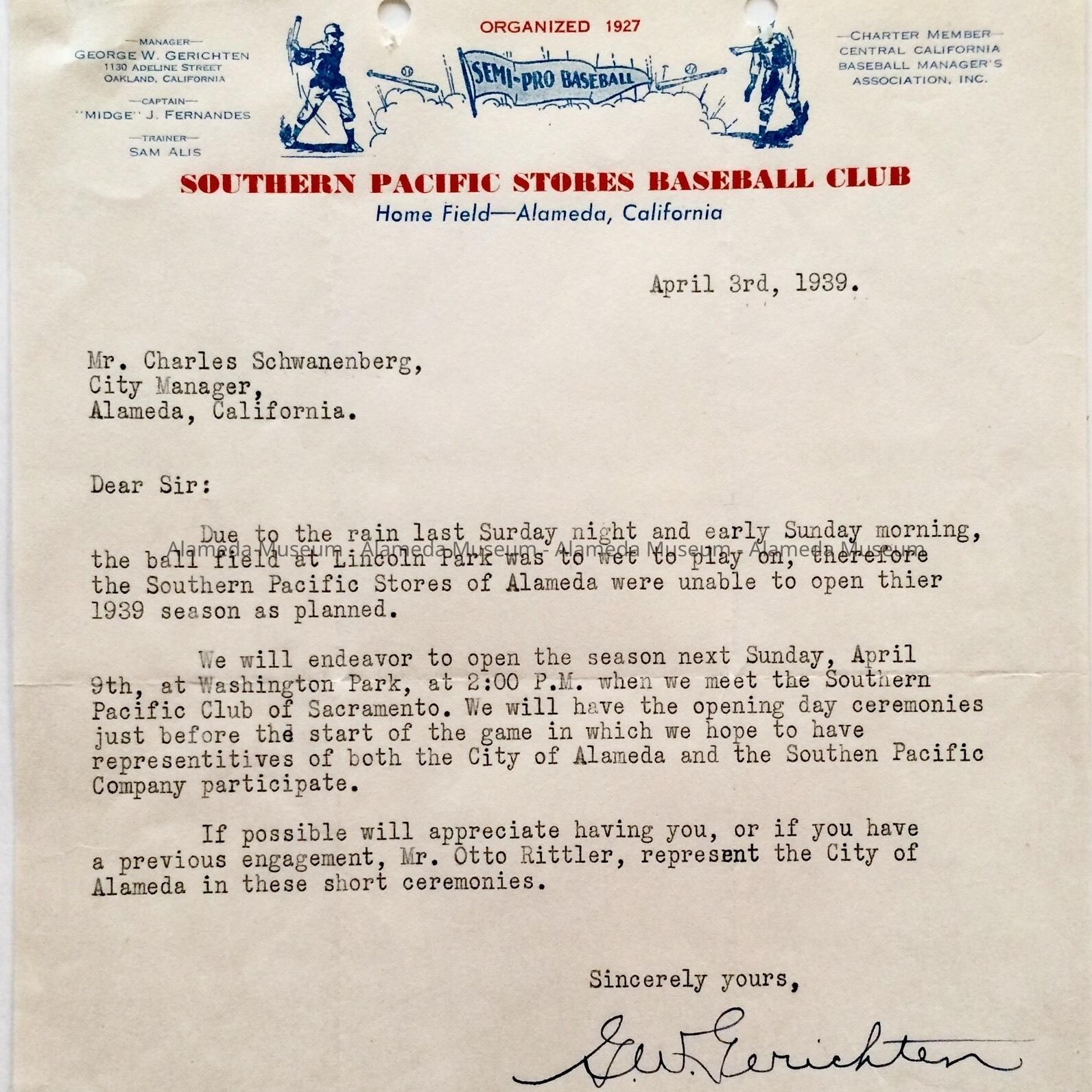 A LETTER, DATED APRIL 3, 1939, ADDRESSED TO MR CHARLES SCHWANENBERG, CITY MANAGER, CONCERNING THE FAILURE OF THE SOUTHERN PACIFIC STORES BASEBALL CLUB TO OPEN THE 1939 BASEBALL SEASON AT LINCOLN PARK, DUE TO HEAVY RAINFALL.