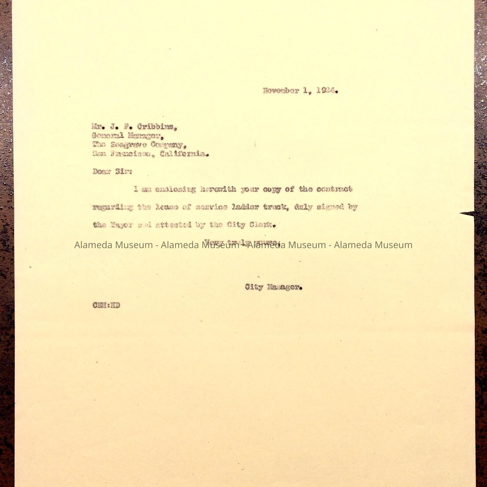 Letter about lease of a service ladder truck by the Fire Department, 1924Entry/Object ID