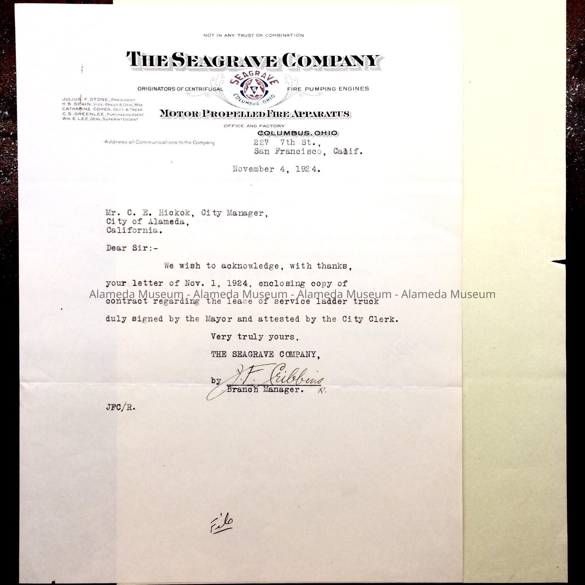 A LETTER ADDRESSED TO C E HICKOK, CITY MANAGER, REGARDING A CONTRACT FOR THE LEASE OF A SERVICE LADDER TRUCK BY THE ALAMEDA FIRE DEPARTMENT. ACCOMPANYING THE LETTER IS ANOTHER, ACKNOWLEDGING RECEIPT.
