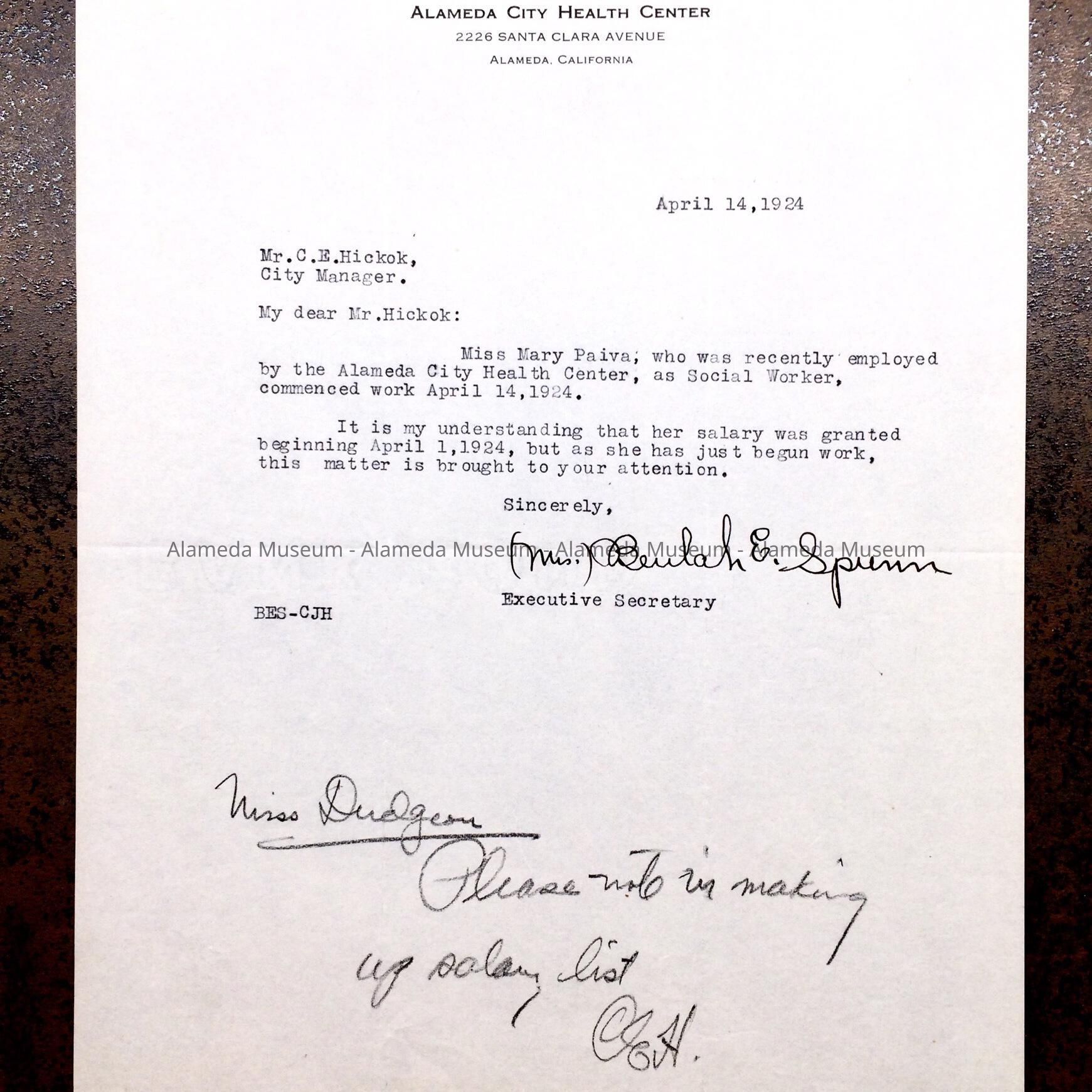 LETTER ADDRESSED TO C E HICKOK, CITY MANAGER OF ALAMEDA, CONCERNING THE EMPLOYMENT OF MS MARY PAIVA AS SOCIAL WORKER.