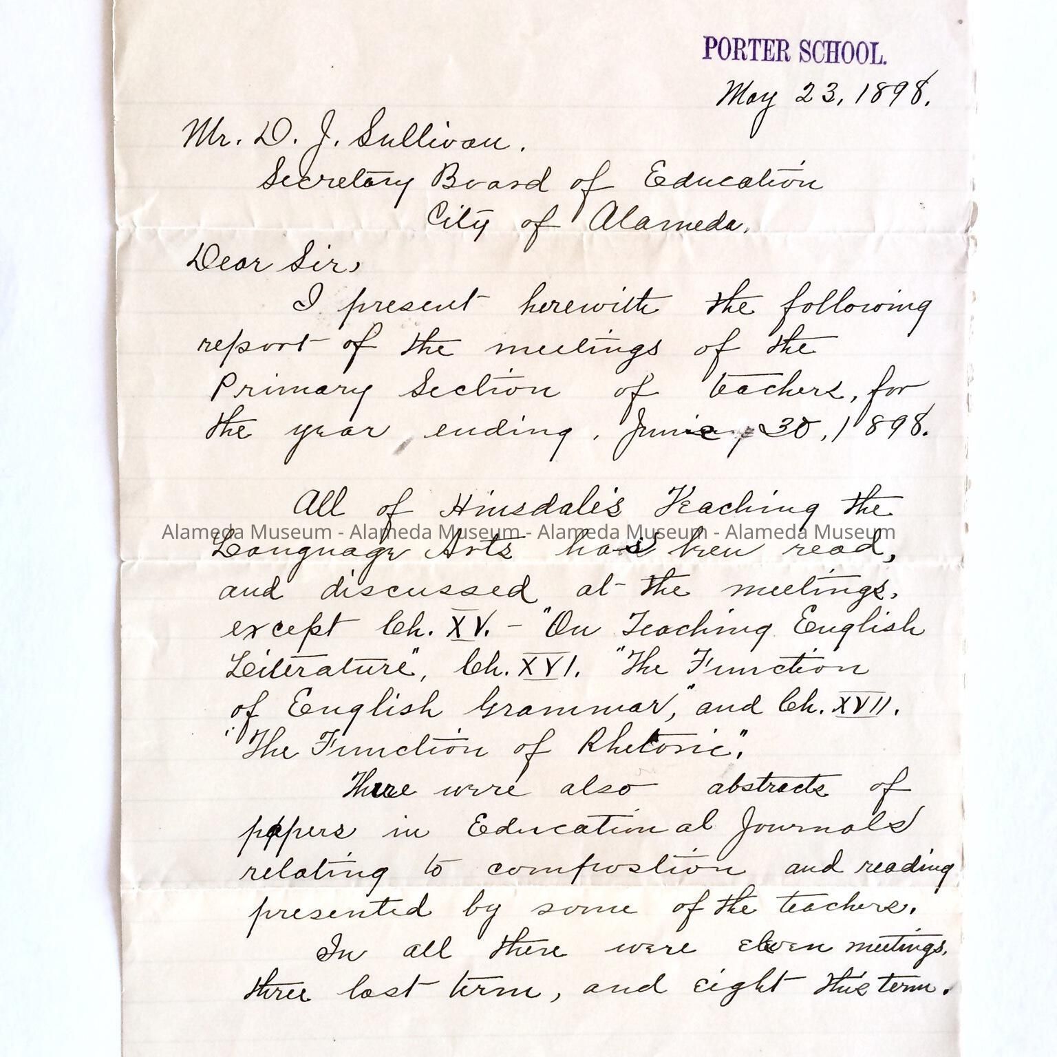 Letter addressed to D.J. Sullivan, Secretary, Board of Education, dated May 23, 1898 concerning a meeting of the primary section of teachers for the year ending June 30, 1898. The meeting concerned the curriculum and the textbooks implemented in language arts, English, etc.