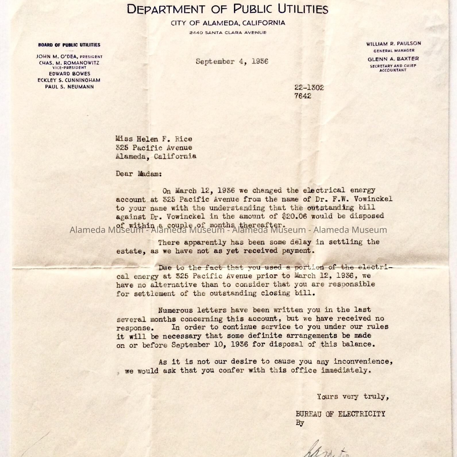 HISTORY OF OBJECT: A LETTER ADDRESSED TO HELEN F. RICE, EXECUTRIX, CONCERNING PAYMENT OF THE ELECTRIC BILL AT 325 PACIFIC AVENUE, IN NAME OF DR. F. W. VOWINCKLE.