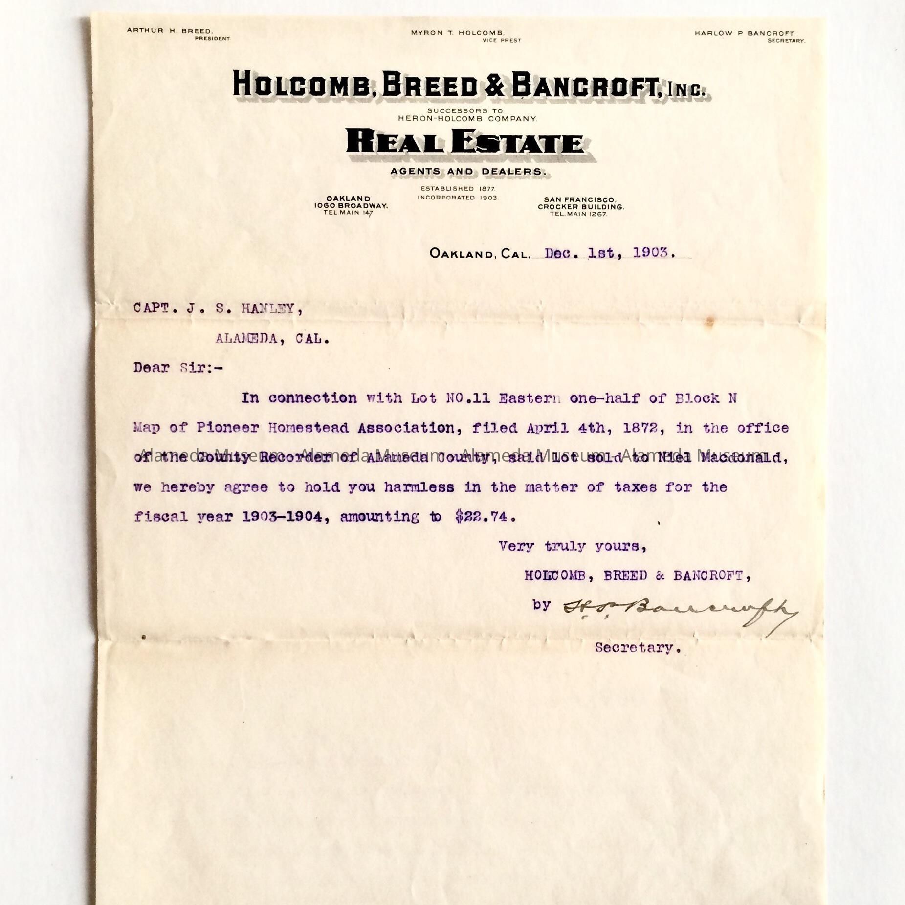 A TYPEWRITTEN LETTER IN PURPLE-COLORED INK ON LETTERHEAD STATIONERY: "HOLCOMB, BREED, AND BANCROFT, REAL ESTATE."