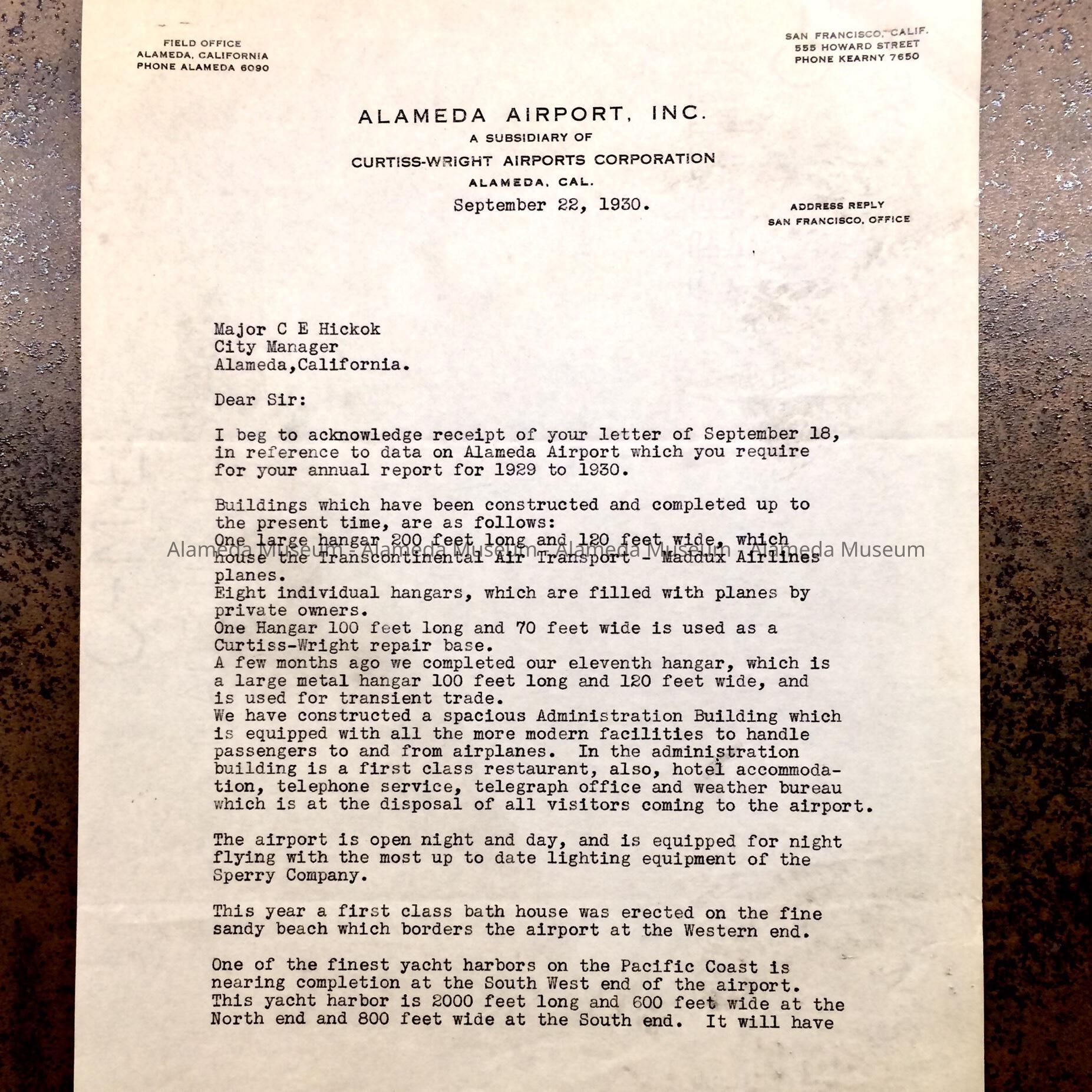 LETTER ADDRESSED TO C E HICKOK, CITY MANAGER, CONCERNING THE OPERATION AND DESCRIPTION OF HANGARS, ETC., OF THE ALAMEDA AIRPORT, INC. SUBSIDIARY OF CURTISS-WRIGHT AIRPORTS CORPORATION, ALAMEDA, CAL., SEPTEMBER 22, 1930. LETTER WAS SIGNED BY R R NICKERSON, FIELD SUPERINTENDENT.
