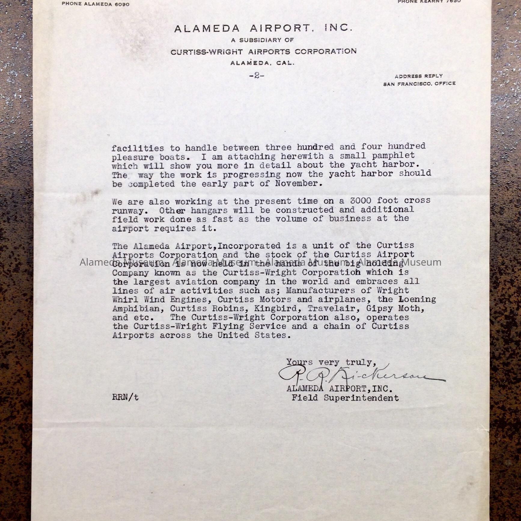 Letter about services at Alameda Airport, subsidiary of Curtiss-Wright, 1930Entry/Object ID