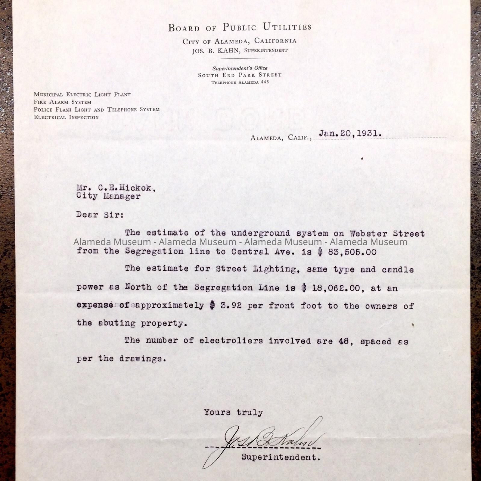 HISTORY OF OBJECT: A LETTER ADDRESSED TO MR. C. E. HICKOK, CITY MANAGER, QUOTING A PRICE FOR DEVELOPING UNDERGROUND ELECTRICAL SYSTEM ON CENTRAL AVENUE, ALAMEDA; SIGNED BY JOSEPH B. KAHN, SUPERINTENDENT OF MUNICIPAL ELECTRIC LIGHT PLANT, CITY OF ALAMEDA.