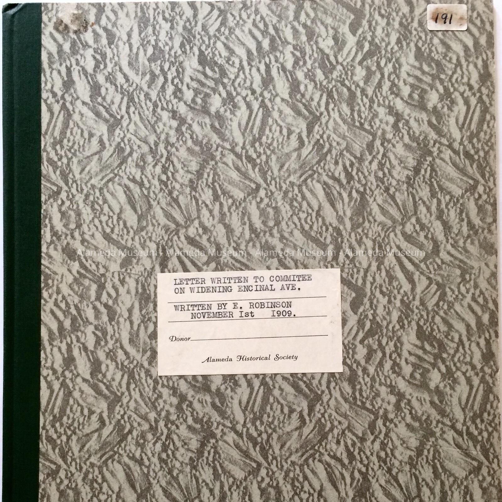 History of Object: copy of a typed letter from E. Robinson to the Committee on Widening of Encinal Avenue, 1909, agreeing to sell land between Broadway and Pearl Street and to move his house and fence 25 feet northward.