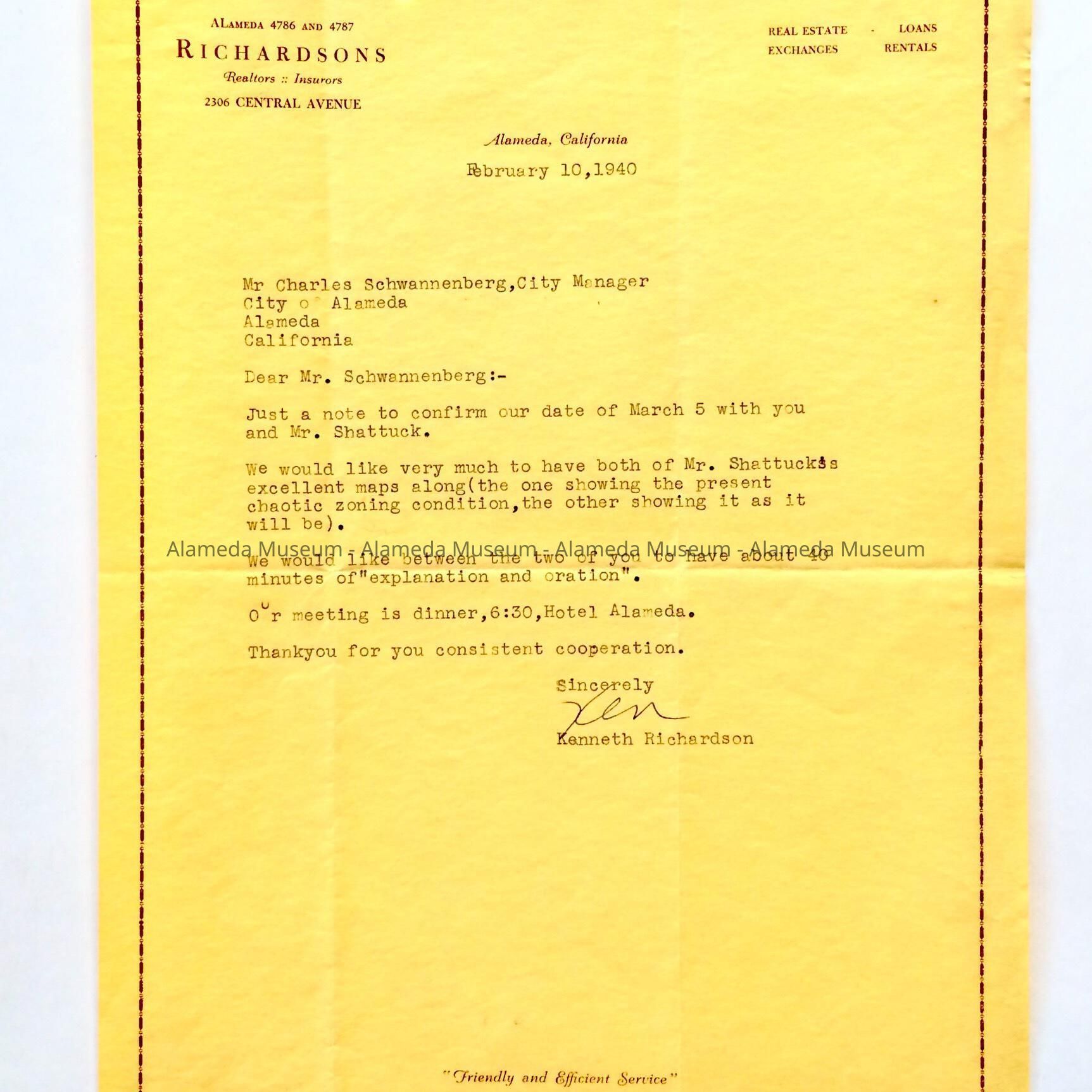 A LETTER ADDRESSED TO MR CHARLES SCHWANENBERG, CITY MANAGER, FROM KENNETH RICHARDSON, REALTY AND INSURANCE, CONCERNING A MEETING SHOWING THE CITY MANAGER A MAP OF ZONING CONDITIONS IN THE CITY OF ALAMEDA.