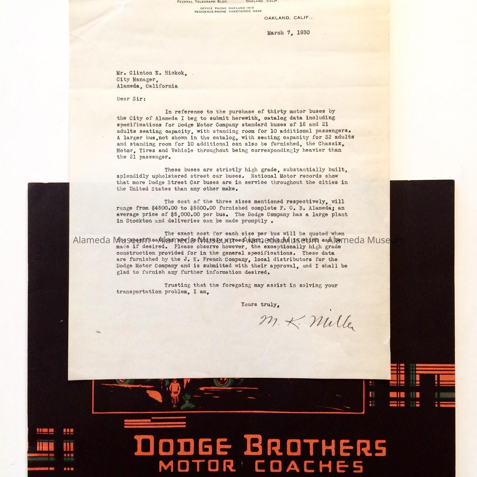 HISTORY OF OBJECTS: A LETTER ADDRESSED TO C. E. HICKOK, CITY MANAGER, DATED MARCH 7, 1930, FROM M. K. MILLER, CONCERNING THE PURCHASE OF 30 MOTOR COACHES (BUSES) BY THE CITY OF ALAMEDA FROM THE DODGE BROTHERS MOTOR COACH COMPANY.