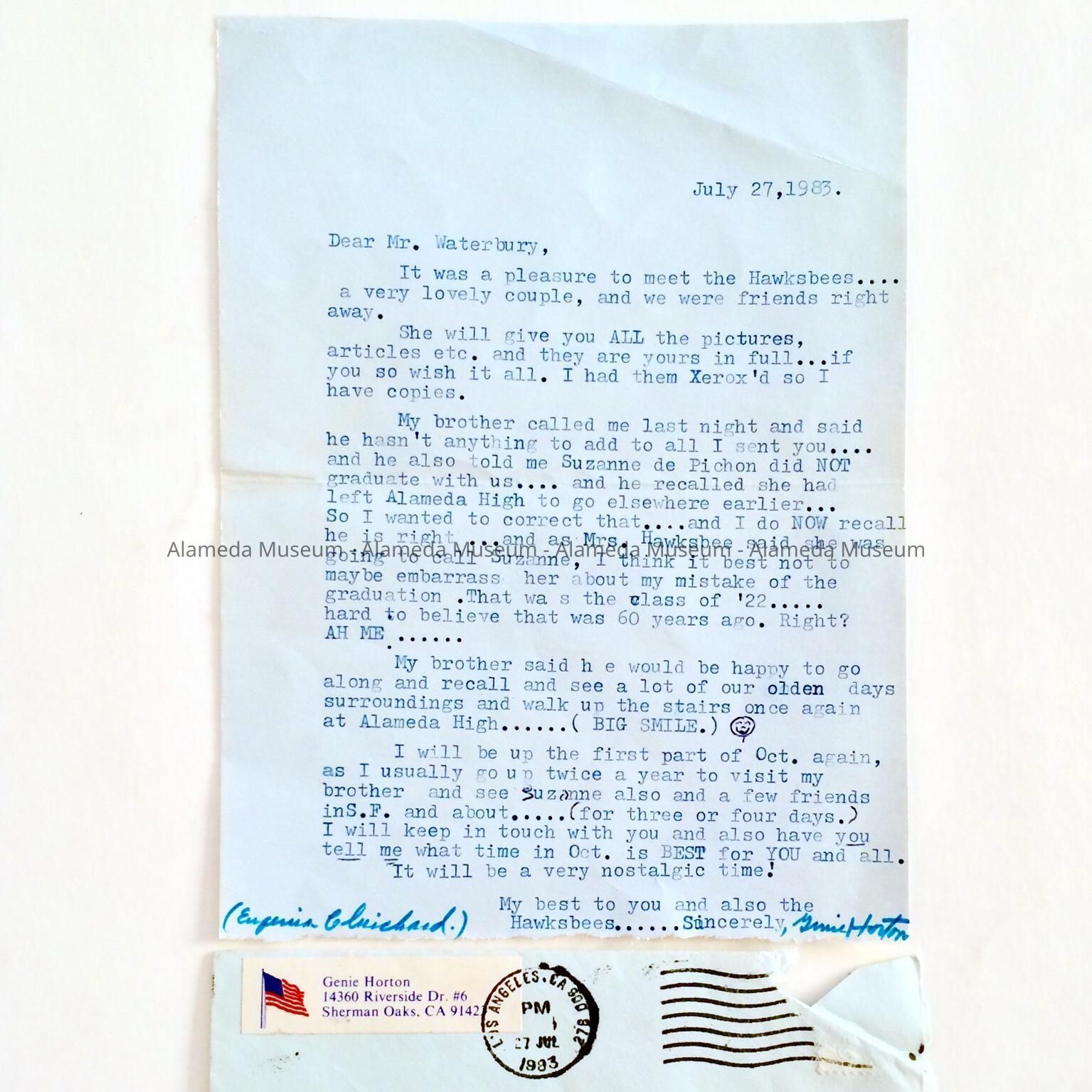 History of Object: Letter sent to Mr. Archie Waterbury (then Vice-President Alameda Historical Society) from Genie Horton (formerly Eugenia Clinchard, Alameda child actress), dated July 27, 1983, in which she recalls past events and discusses the collection she is donating to the museum.