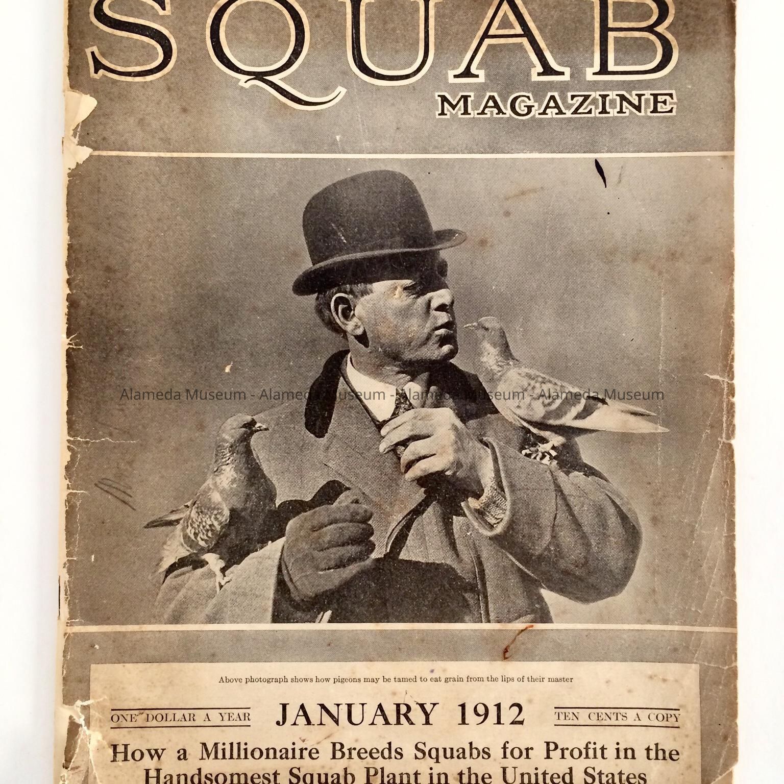 A) Magazine with photolithographic illustration and bold printed caption "National Squab Magazine" in gray, black and white colored type.