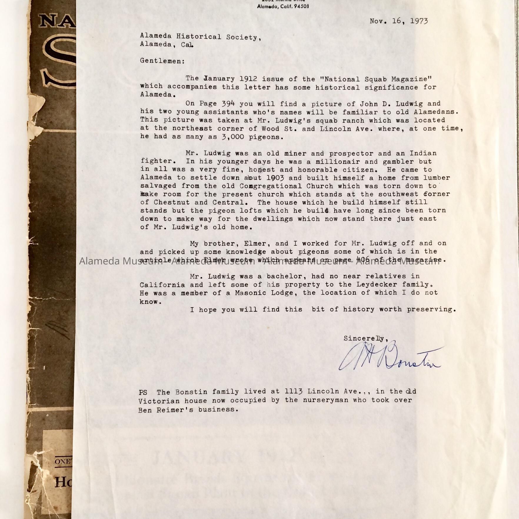 History: Magazine entitled National Squab January 19, 1912 with an article on page 394 concerning the squab ranch of Mr. Ludwig at Wood Street and Lincoln Avenue. The accompanying letter written by the donor gives further information on Mr. Ludwig.