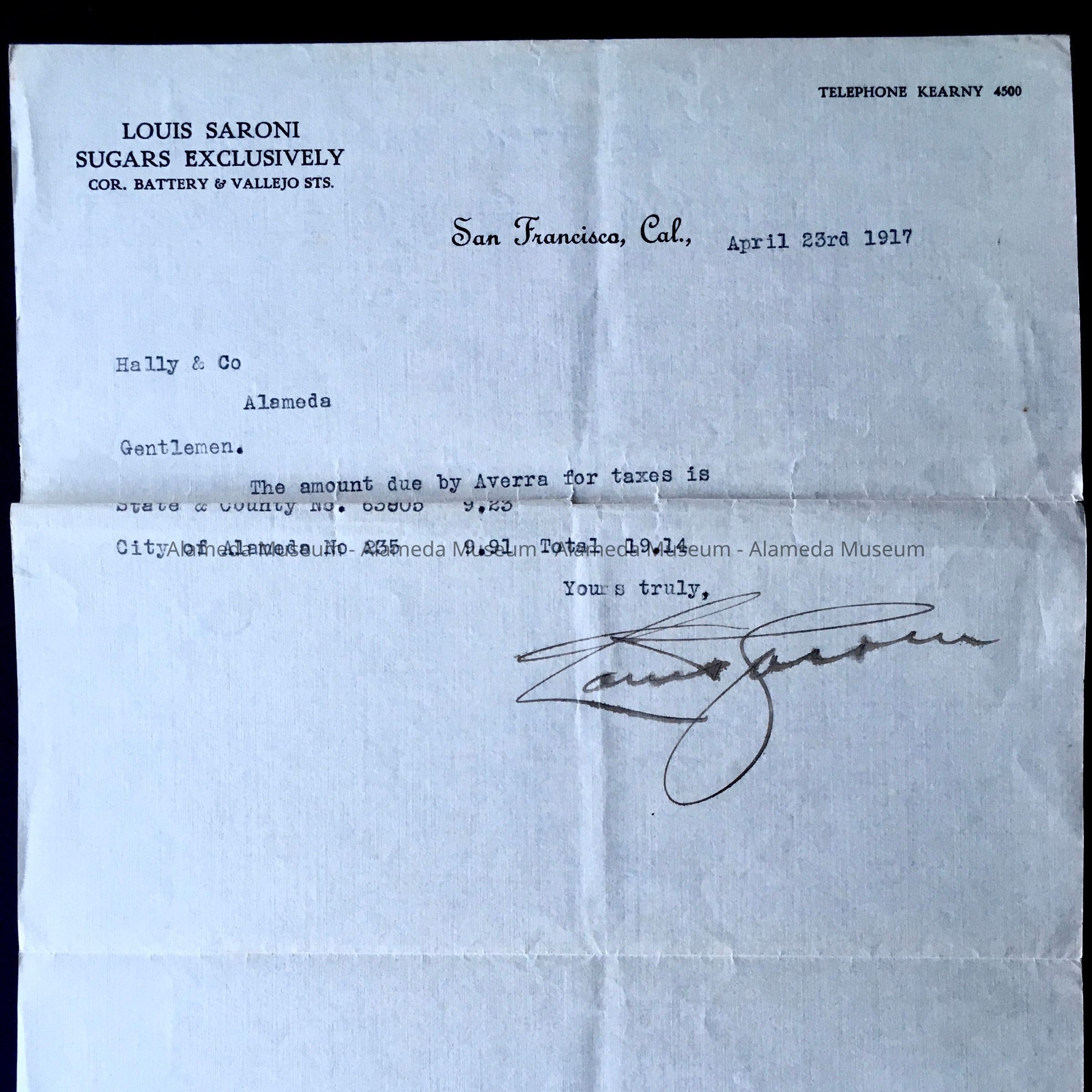 Letter to W. T. Avera from Louis Saroni (agent & brother of Mrs. David Hirschfeld) concerning payments on 3261 Garfield Avenue