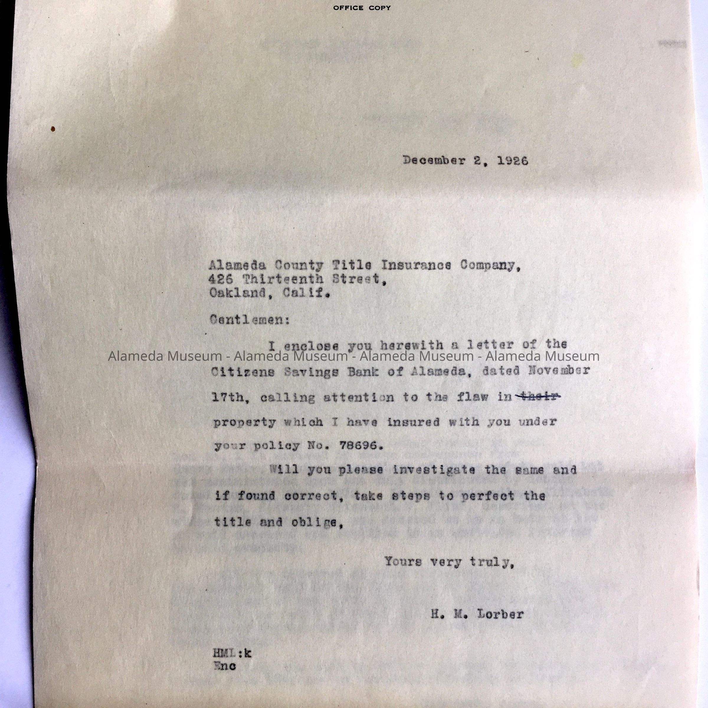 LETTER TO H M LORBER, DATED DECEMBER 13, 1926, FROM THE ALAMEDA COUNTY TITLE INSURANCE COMPANY, AND BACKUP CORRESPONDENCE ORIGINATED BY MR LORBER, CONCERNING PROPERTY ON THE EAST END OF ALAMEDA: VICINITY OF COURT, MOUND, AND VAN BUREN STREETS, ALAMEDA.