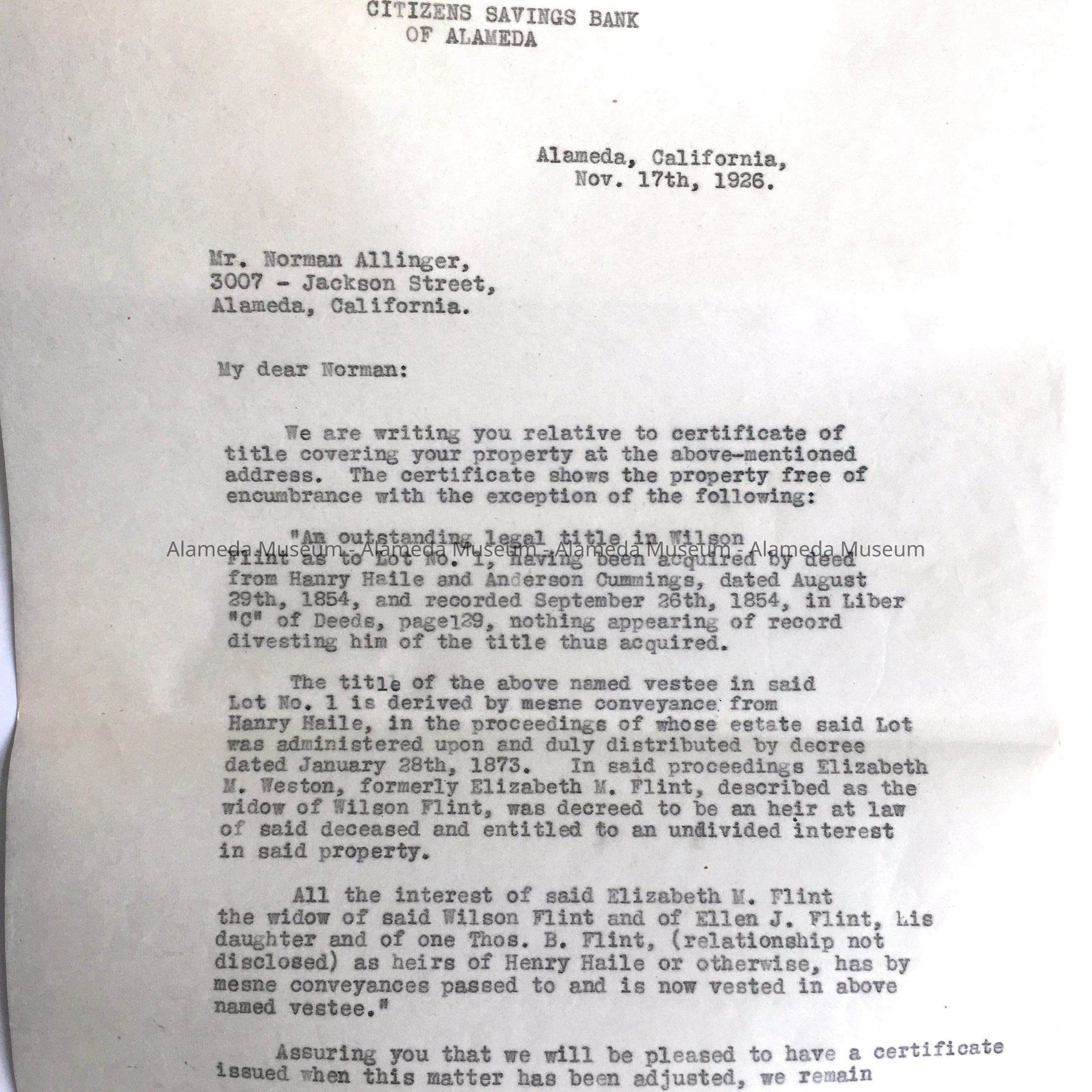 SERIES OF THREE TYPEWRITTEN LETTERS ATTACHED BY METAL CLIP. COVER LETTER HAS BILLED HEADING STATIONERY, WITH BOLD-PRINTED CAPTION, "ALAMEDA COUNTY TITLE INSURANCE COMPANY."