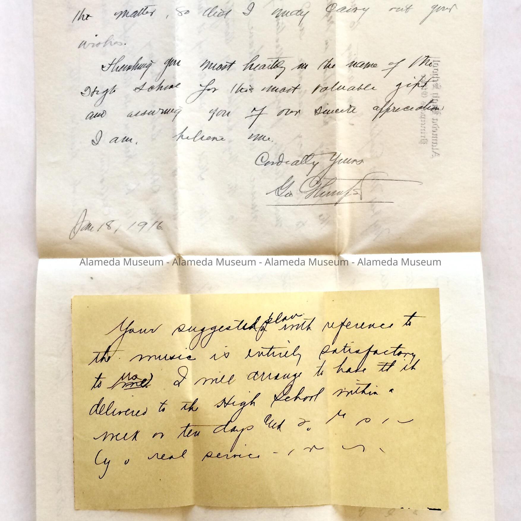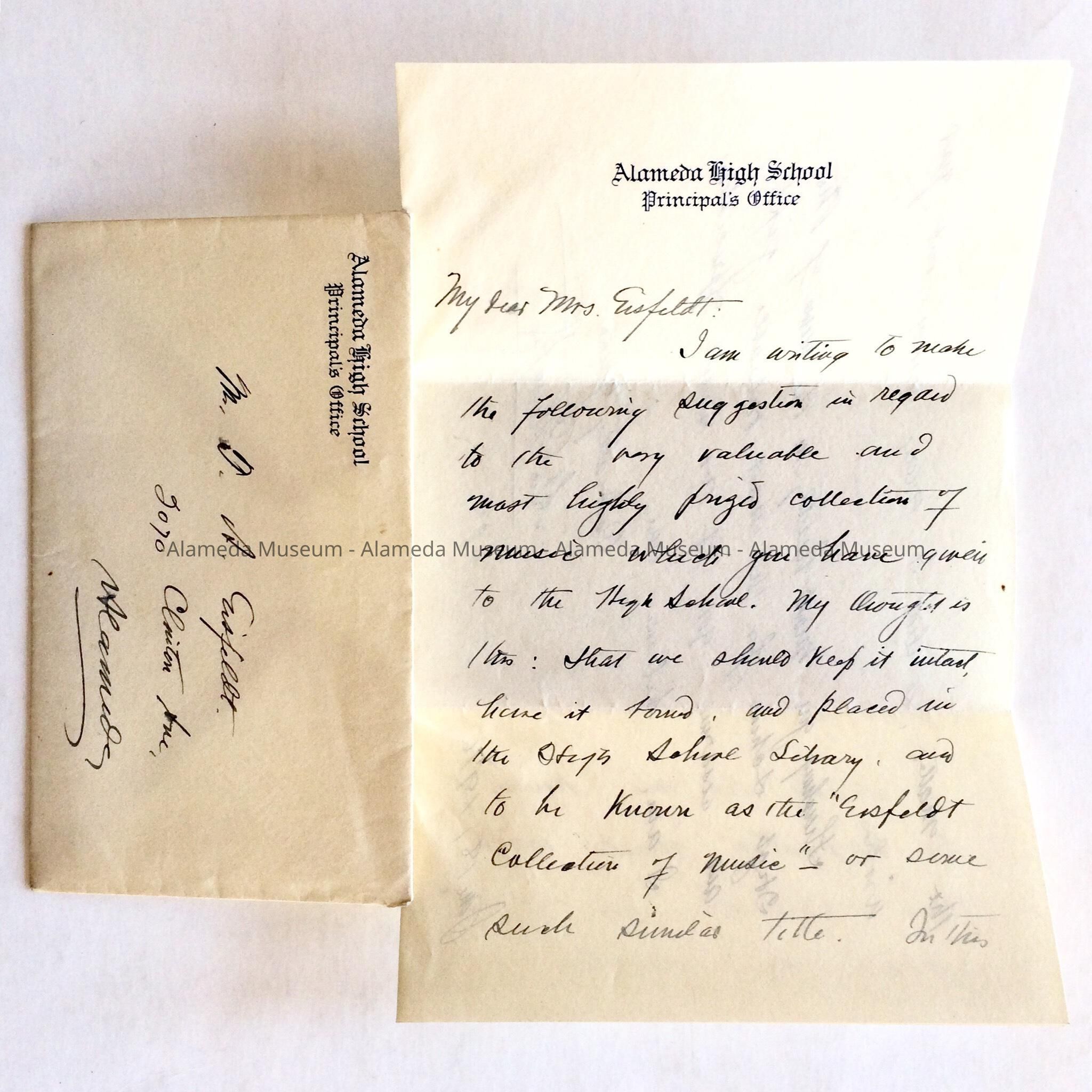Description: Hand written letter on stationery with heading in ornate lettering "Alameda High School, Principal's office." Envelope with matching heading.