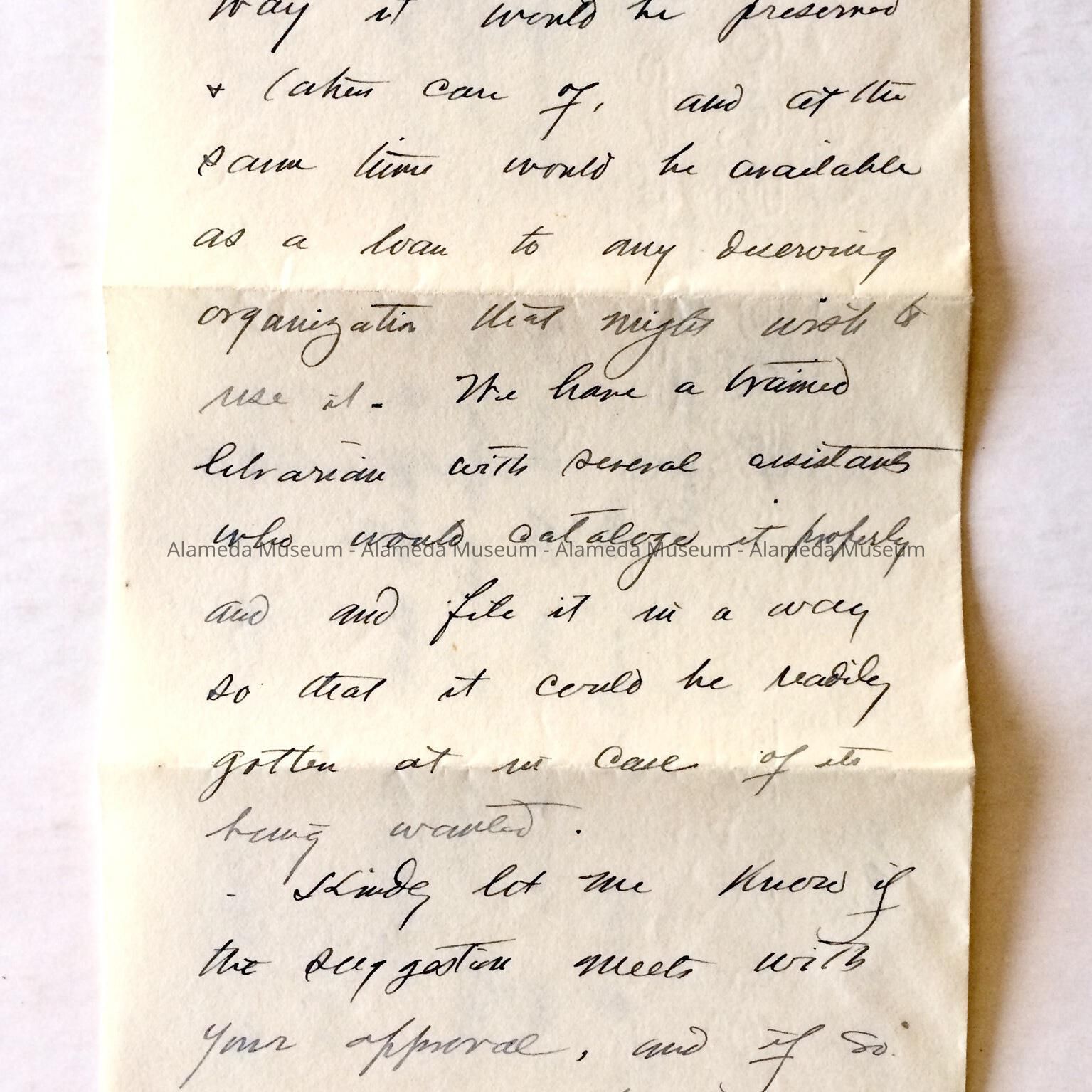 History of Object: Letter addressed to Mrs. T. A. Eisfeldt, 2070 Clinton Avenue, Alameda, from George C. Thompson, principal Alameda High School. In the letter Mr. Thompson suggests the binding of the music Mrs. Eisfeldt had given to the school. He also states that it be known as the "Eisfeldt Collection."